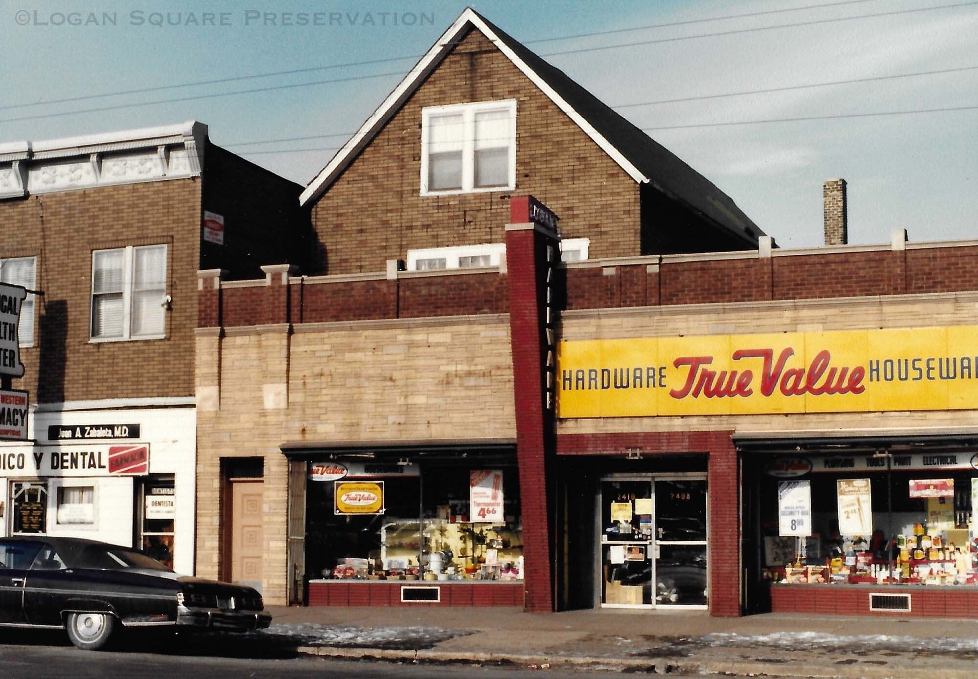 Snapshot photo of Logan Hardware storefront with items on display on a winter afternoon, circa 1970sPhotograph Details