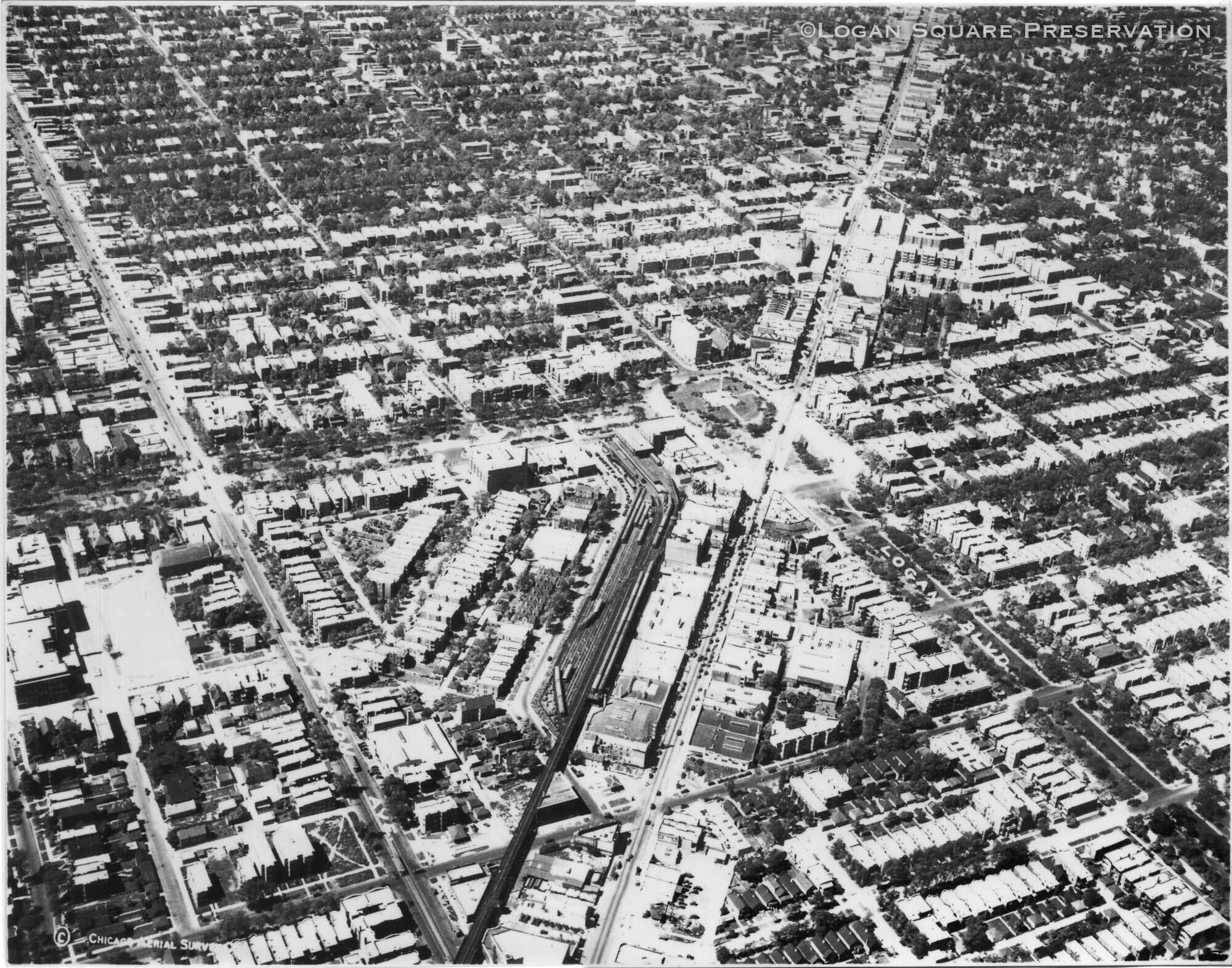 Laminated print of aerial photo looking west-northwest over Logan Square Terminal, circa 1924. Fullerton Ave, Milwaukee Ave, and Logan Blvd marked on photograph.Made/Created