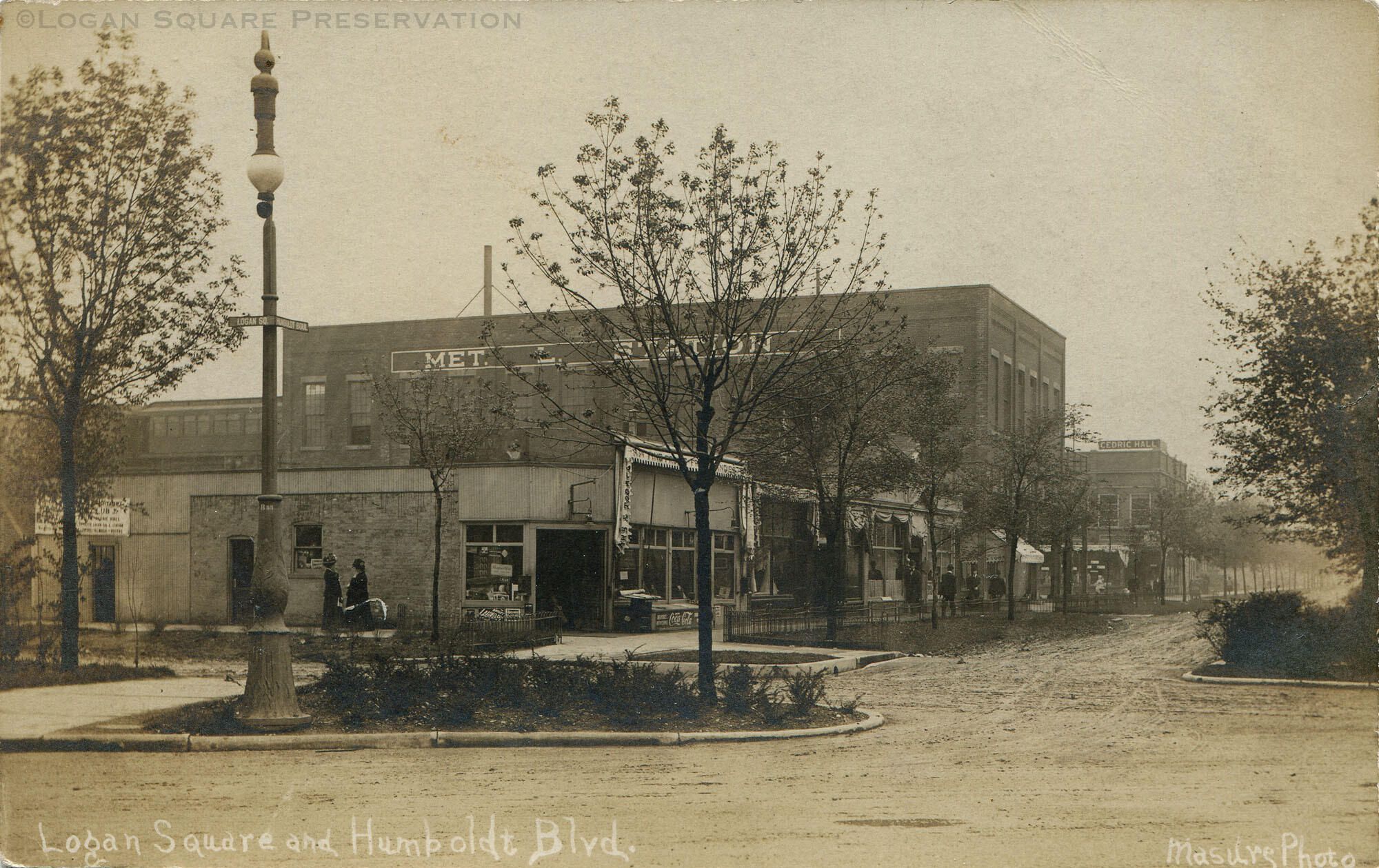 Real-photo postcard view looking southeast at Peter Geannopolous drugstore at corner of Logan & Kedzie Blvds (formerly Humboldt Blvd), circa 1907Subject Place