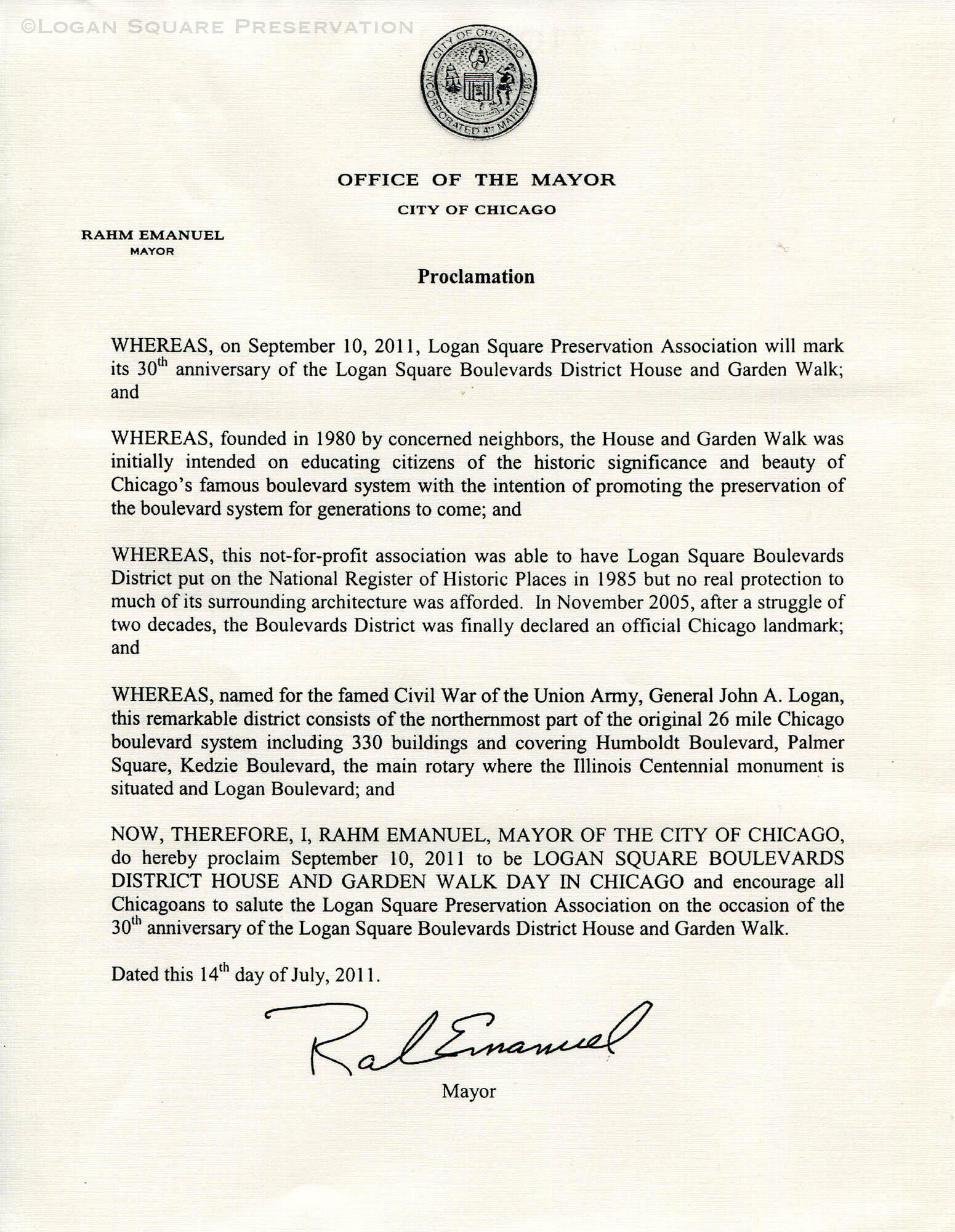 Printed letter proclaiming Sept 10, 2011 as Logan Square Boulevards District house and Garden Walk Day in Chicago by Mayor Rahm Emanuel on July 14, 2011Collection