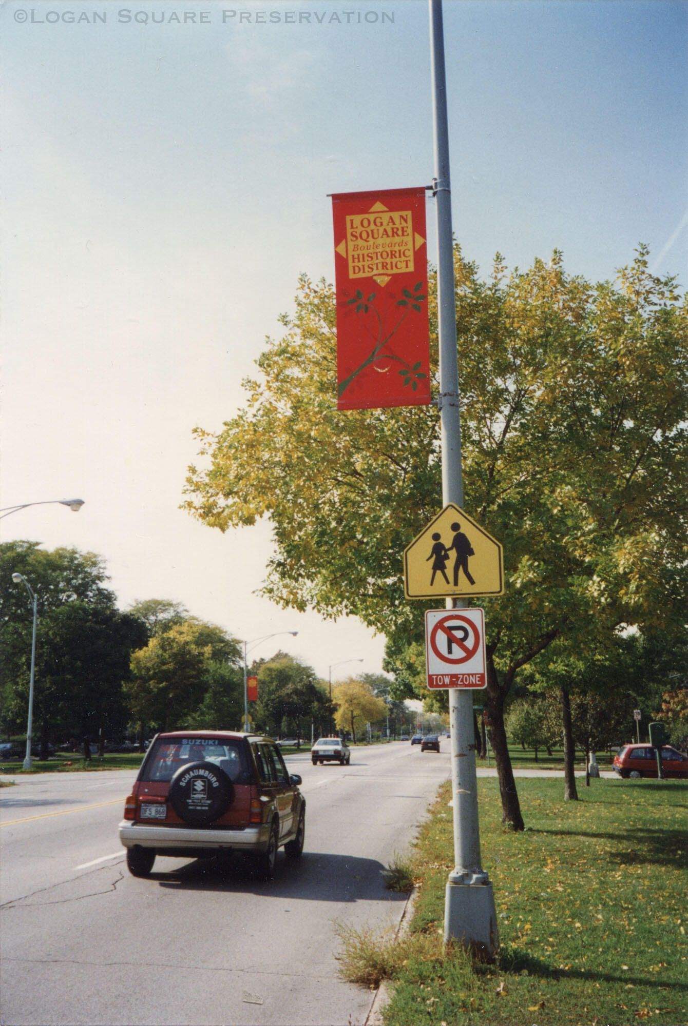 Photo view looking west down Logan Boulevard near Rockwell at red fabric banner on light pole, circa 1996Photograph Details