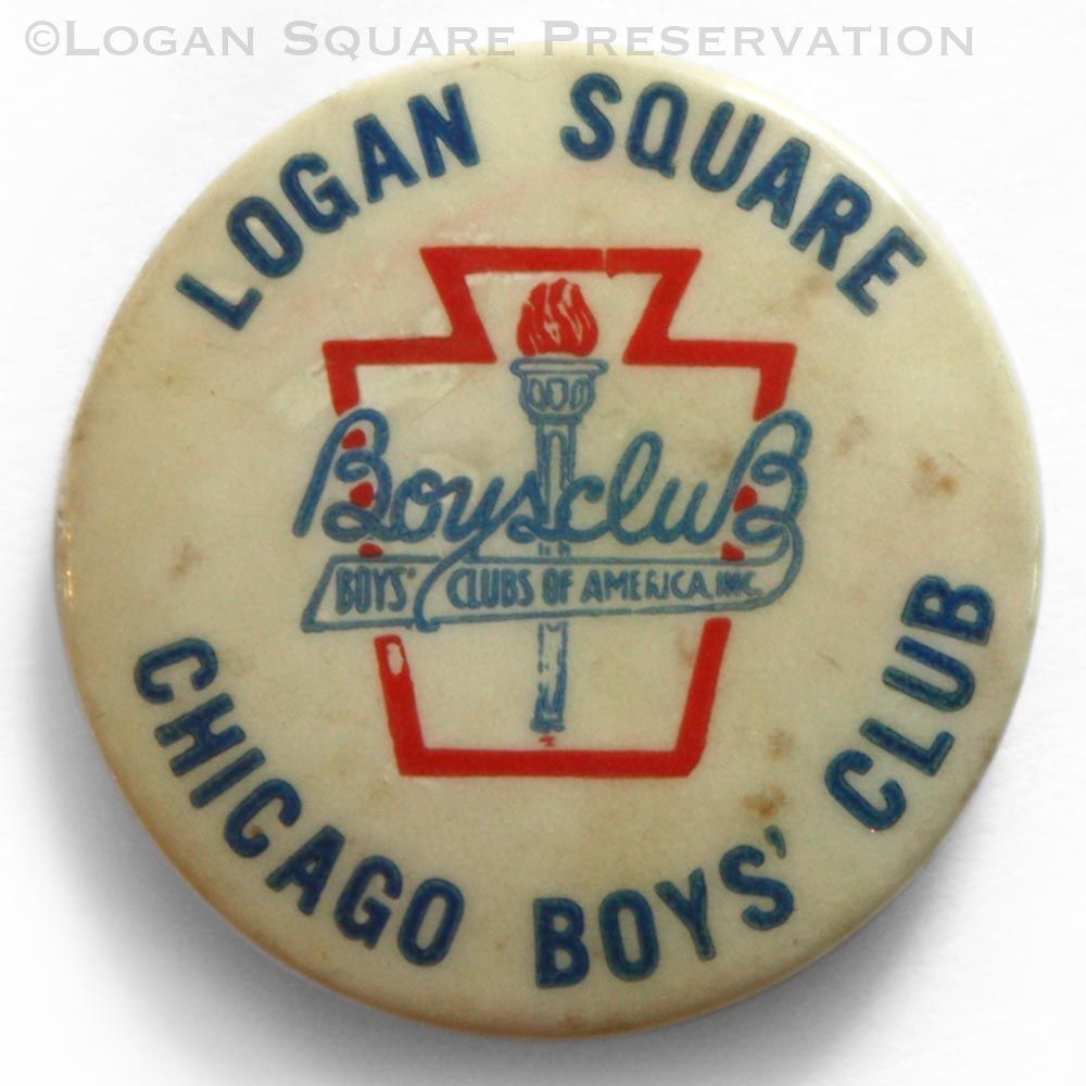 Pinback button with red and blue image of torch in keystone Boys' Club logo printed on celluloid, circa 1950sRelationships