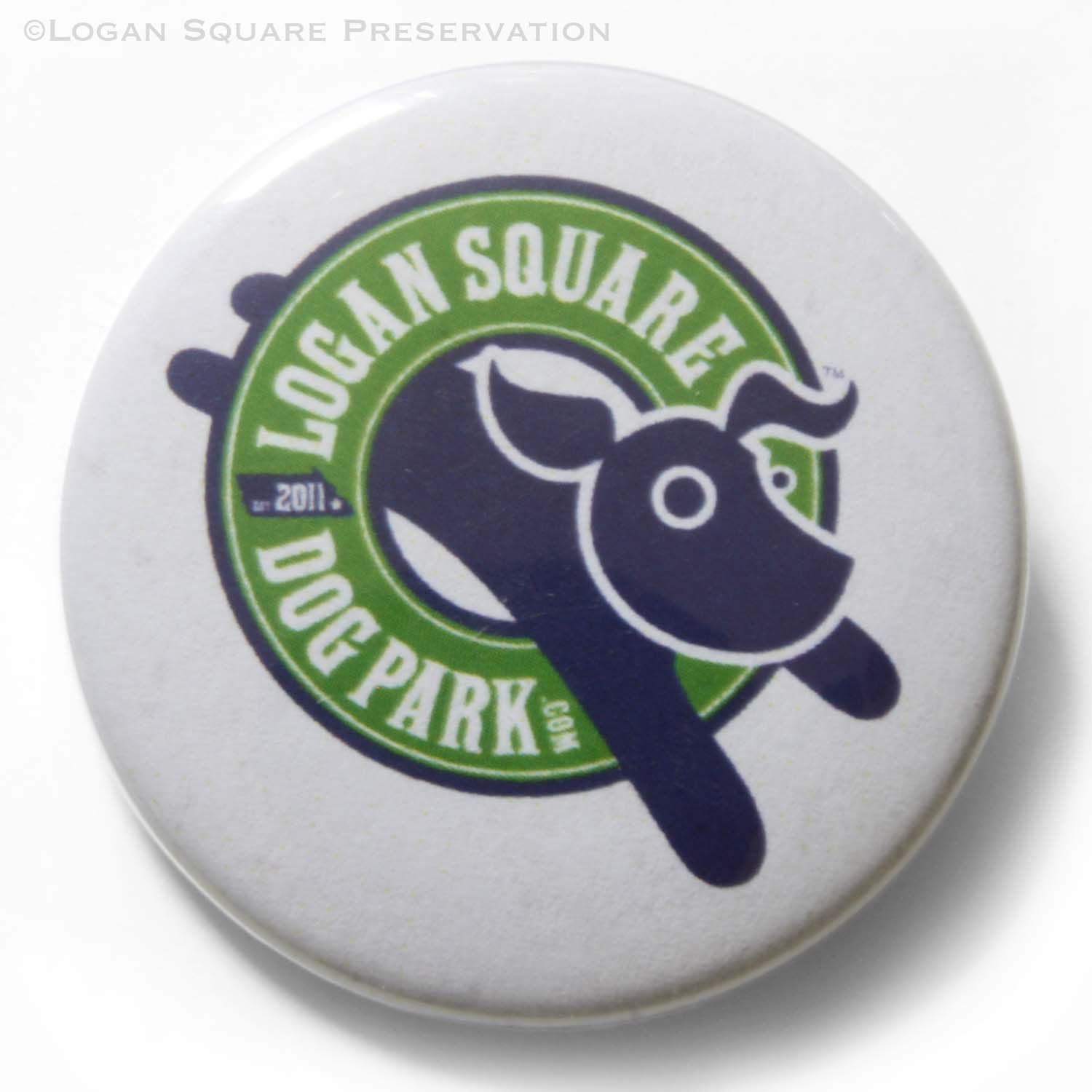 1.5" pinback button promoting establishment of Logan Square Dog Park with logo of blue dog leaping through green hoop, 2011Relationships