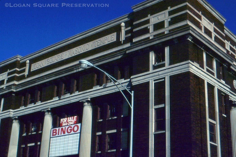 Color slide transparency looking up at west facade of former Logan Square Masonic Temple with blank marquee bingo sign and "For Sale" sign between columns, February 1982Photograph Details