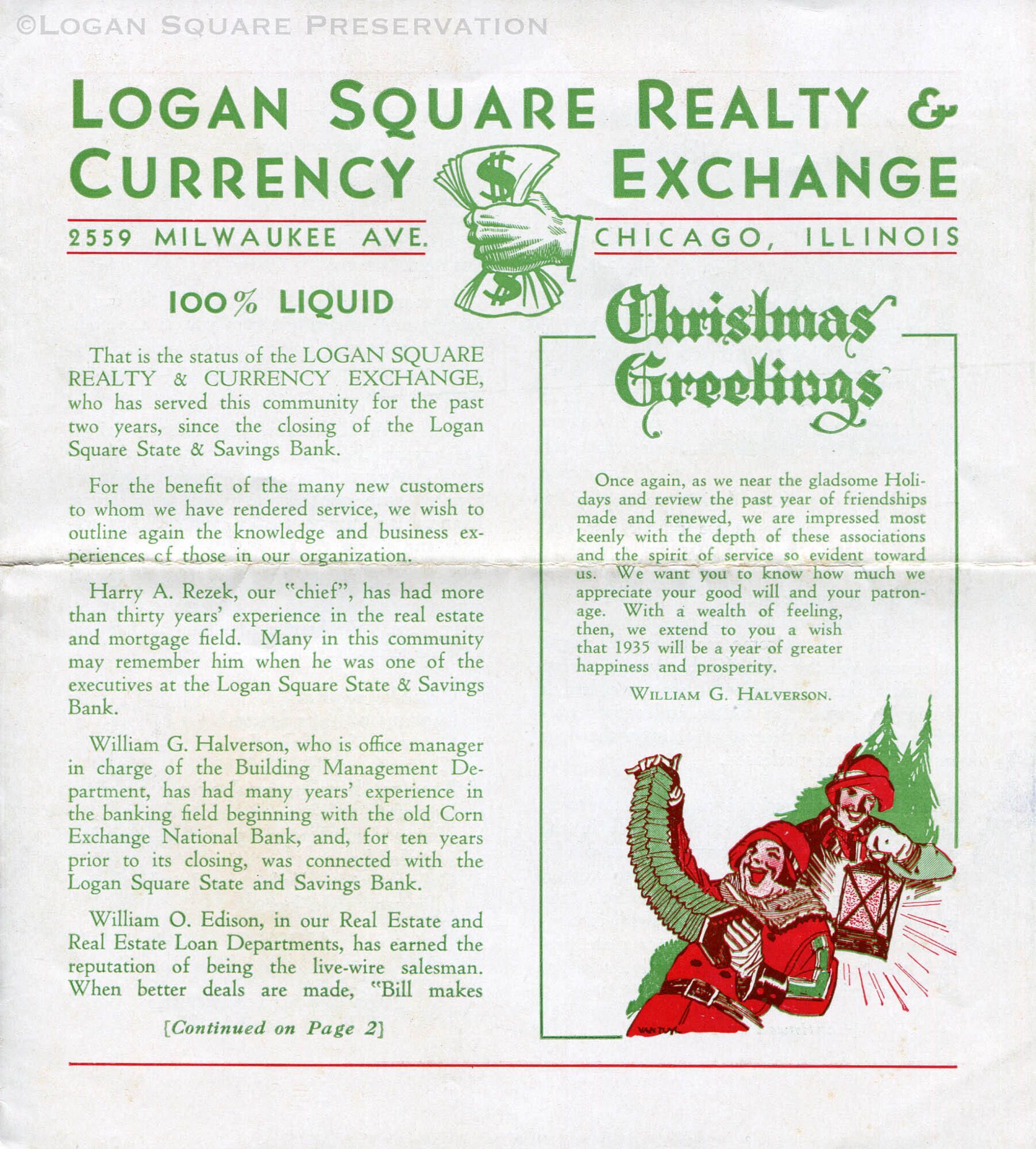 2-panel Christmastime brochure advertising services and insurance plans offered by Logan Square Realty, includes bank hours, jokes and 1935 calendarCollection