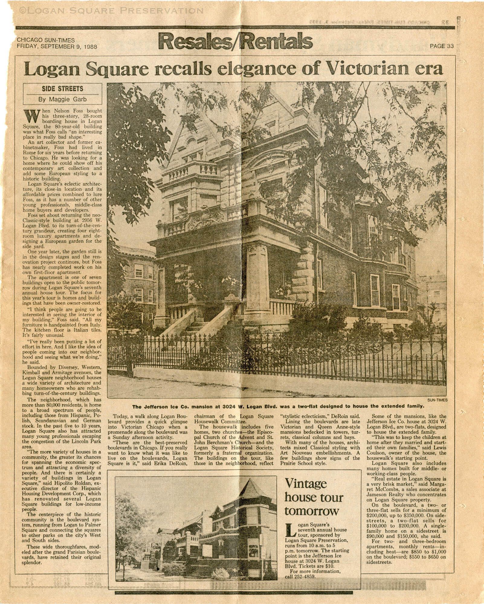 Newspaper clipping of Sept 9, 1988 Chicago Sun-Times article describing houses on Logan Boulevard to be featured on 1988 LSP House Walk