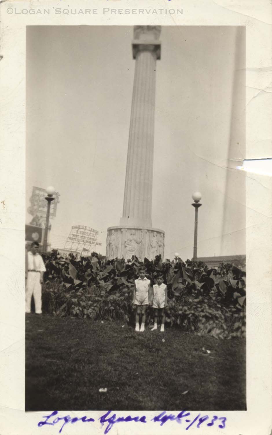 Snapshot photo of Chris & Peter Vaselopulos standing in front of tall elephant ear (Colocasia esculenta) garden plants on south side of Centennial Monument, with Charles Lange & Bros Buick neon signs visible in distance, September 1933Photograph Details