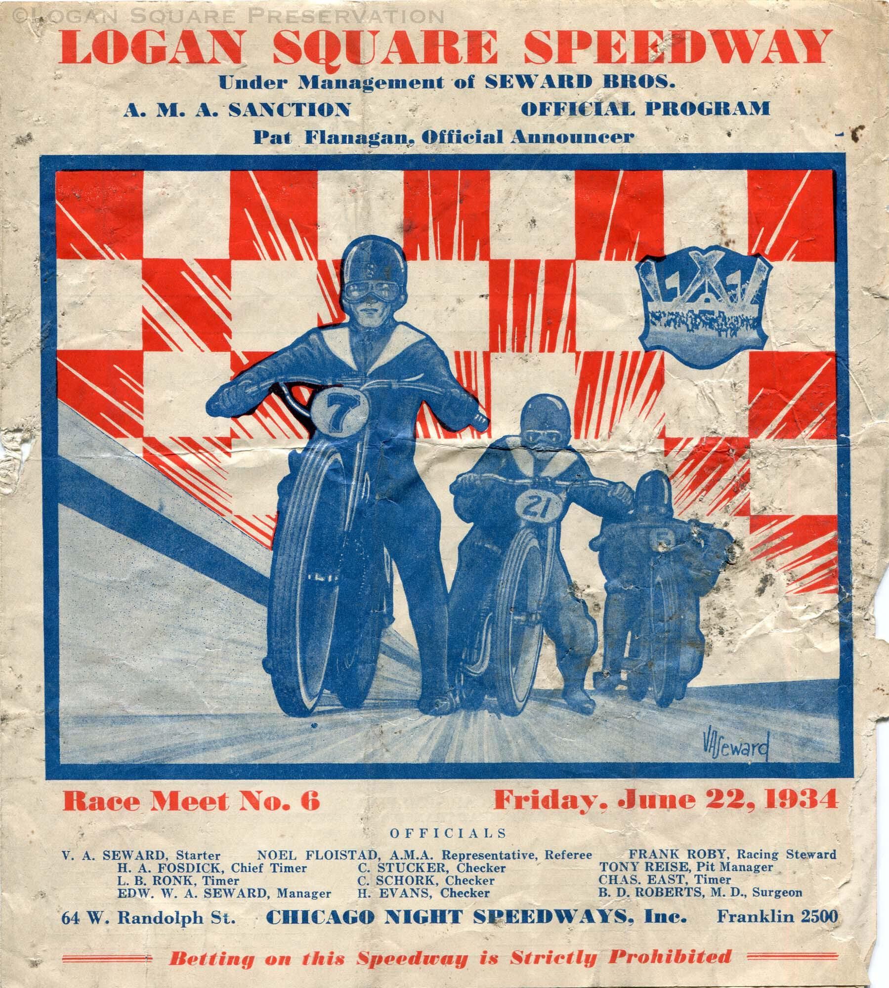 4-panel program printed in red and blue ink with illustration of three flat track motorcycle racers by track manager Edward W.A. Seward at track in Logan Square Ball Park, lists riders in races for Meet No. 6, June 22, 1934Publication Details