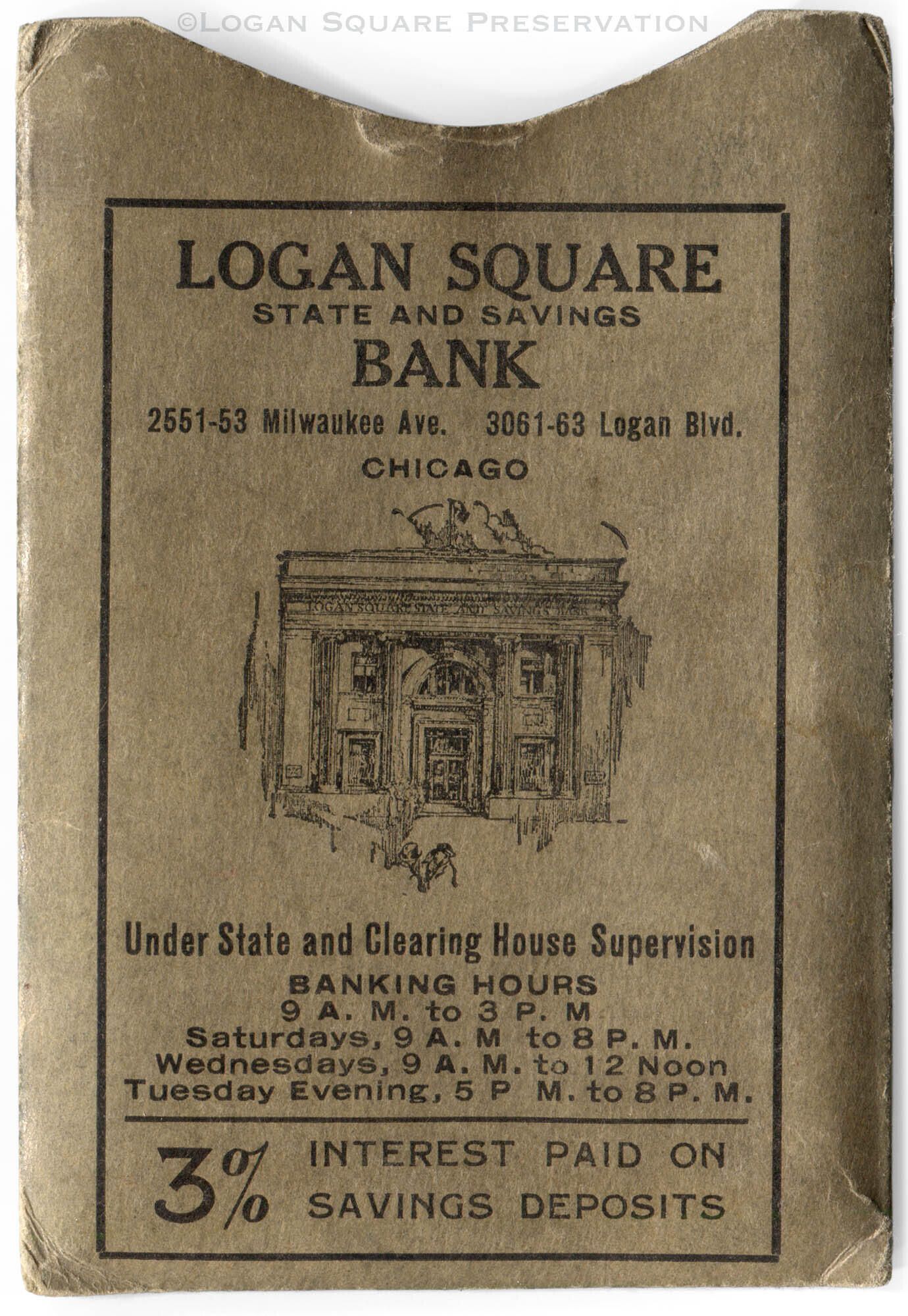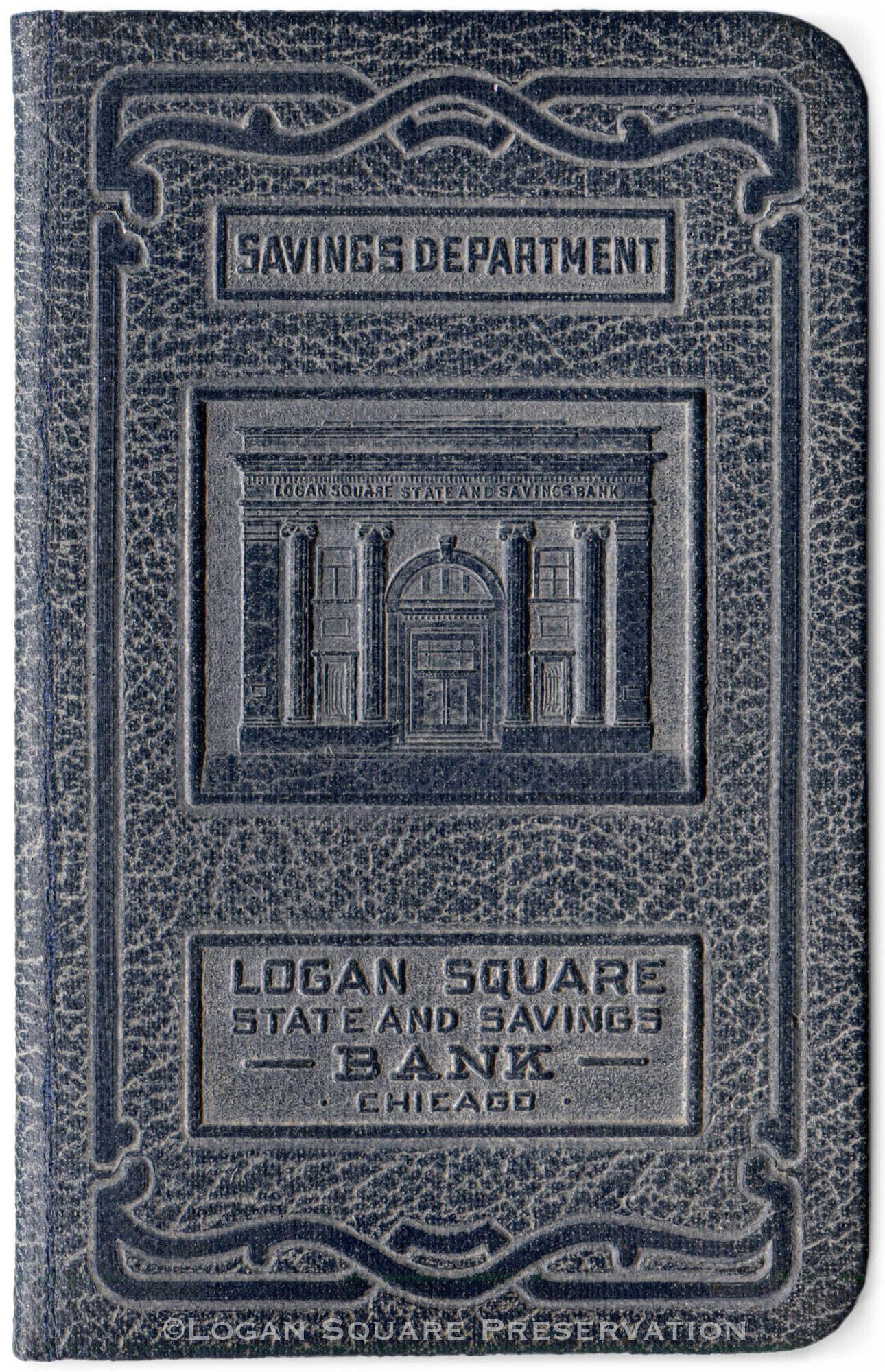 12-page ledger passbook with embossed leather pattern and image of front of Logan Square Savings Bank and storage envelope. Account opened by Arnold & Evelyn Fonke on Apr 7, 1932.Dimensions