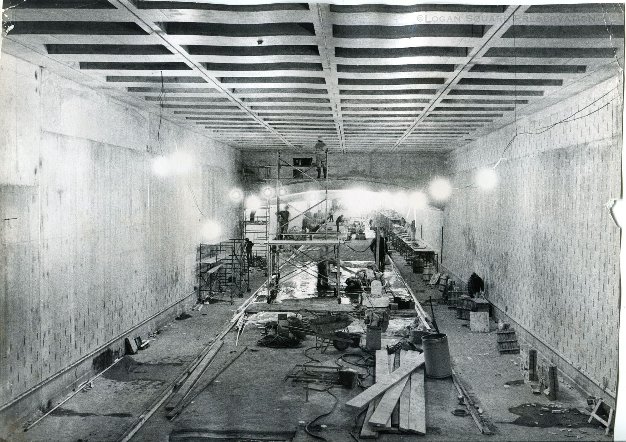 News photo looking northwest at workers on scaffolds in under-construction Logan Square Blue Line subway station, March 1969Photograph Details