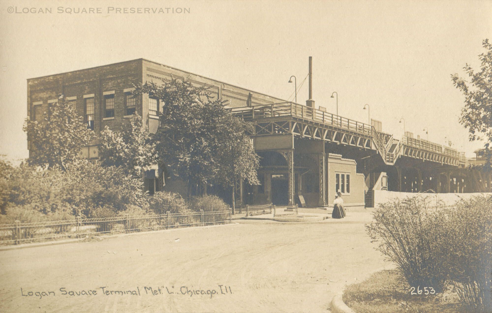 Real-photo postcard view looking northeast across boulevard at Logan Square L Terminal, circa 1910. C.R. Childs postcard #2653Subject