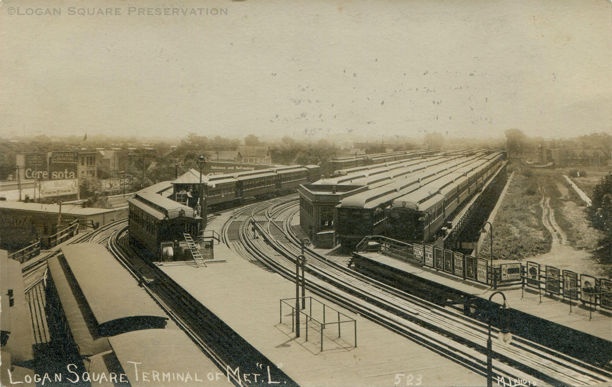 Real-photo postcard view looking southeast across platform of Logan Square L Terminal at parked train cars with view of vacant land on Linden Ct and Milwaukee Ave businesses in distance, circa 1911. May be original photo for colorized Franklin Postcard Co. postcard #054-1Subject