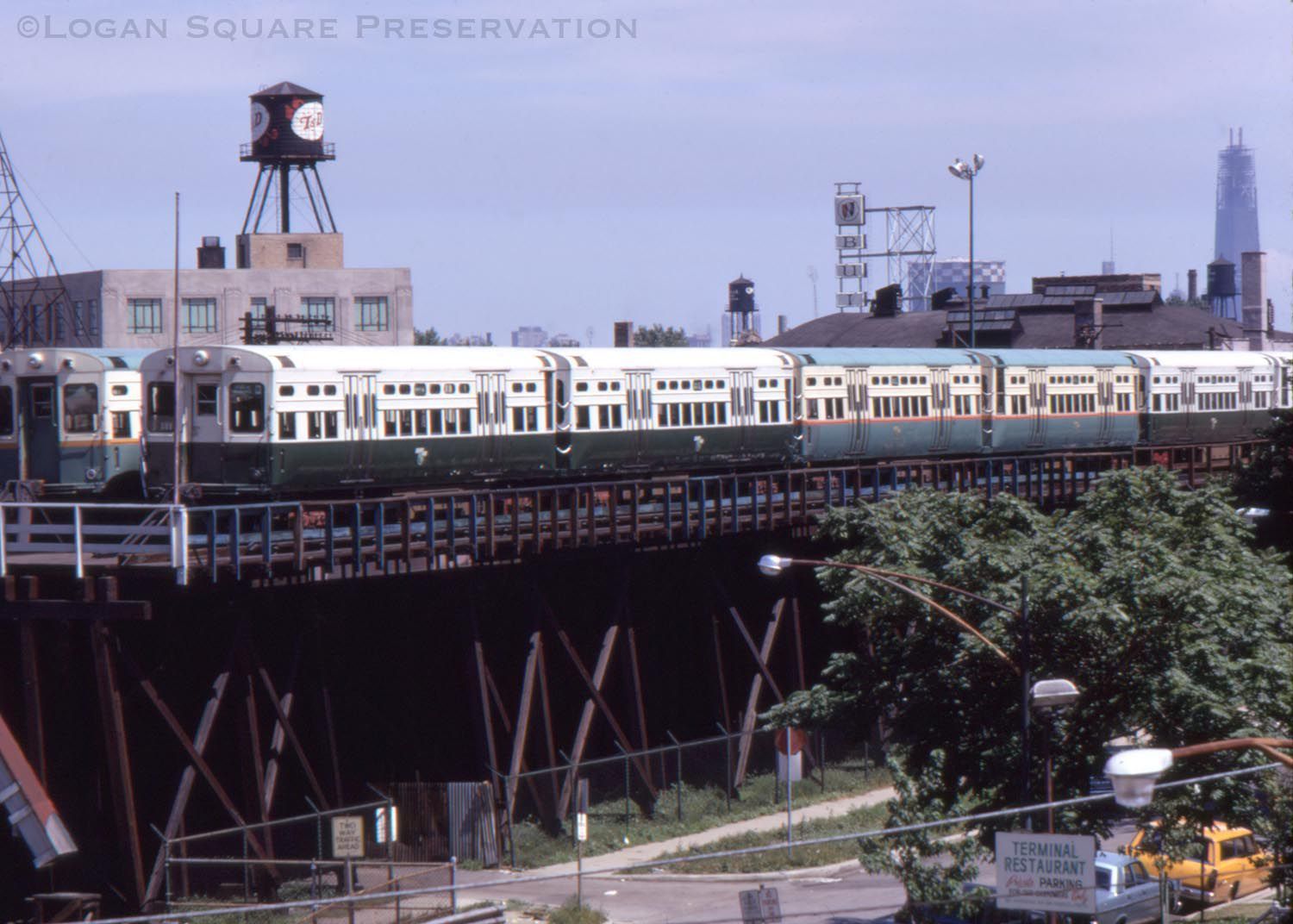 35mm Kodachrome color slide transparency telephoto view of CTA trains in yard at Logan Square Terminal with buildings along Milwaukee Ave in distance, 1968Photograph Details