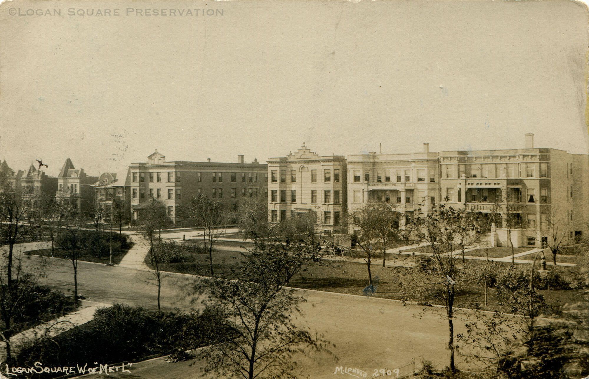 Real-photo postcard view looking southwest across boulevard at apartment buildings on west side of Kedzie Blvd, possibly taken from upper level of Logan Square L Terminal, circa 1910. House at 2438 N. Kedzie Blvd marked with "X".Subject