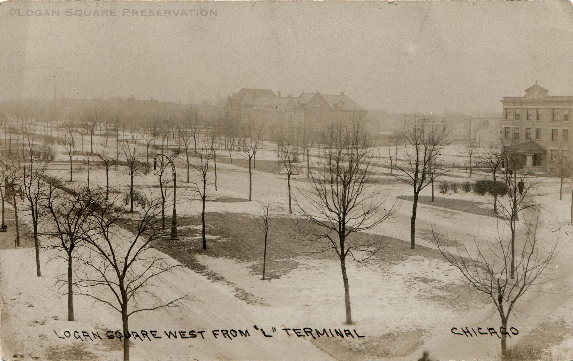 Real-photo postcard view looking southwest from platform of Logan Square Terminal across snowy Kedzie boulevard to apartment buildings on west side of boulevard on overcast winter day, circa 1908Subject