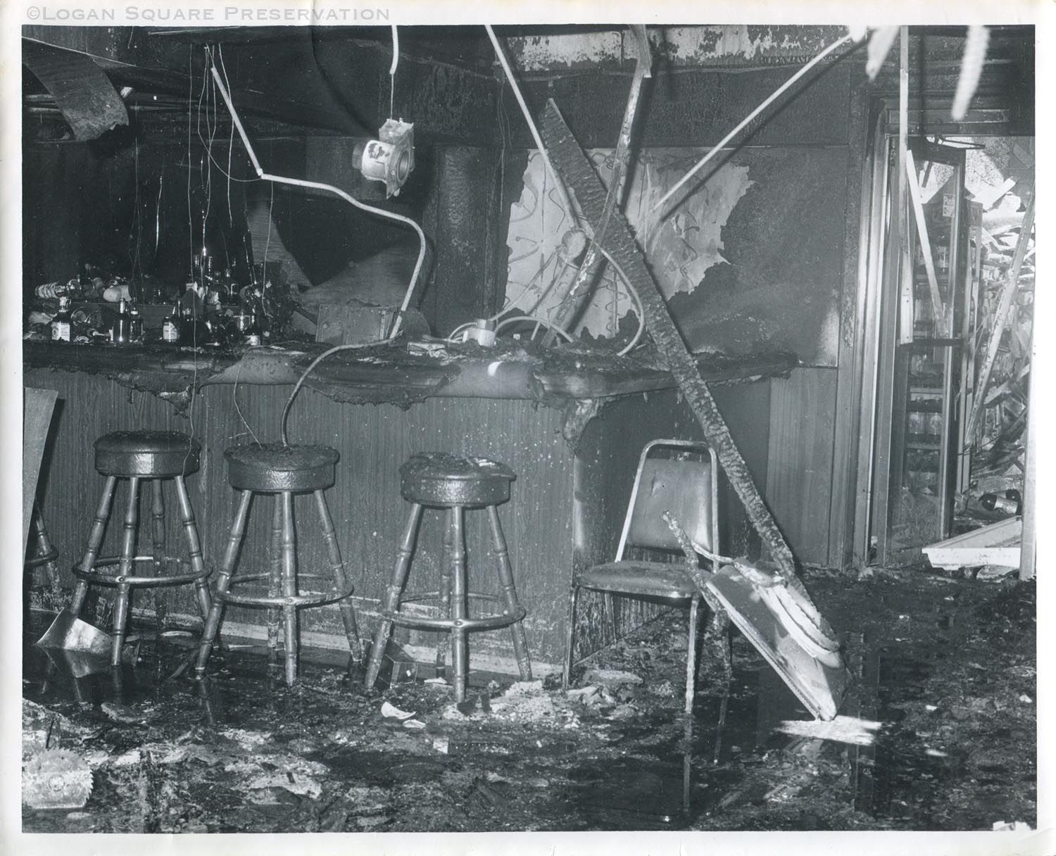 Documentary photo looking in southwest direction at fire-damaged bar, liquor bottles and bar stools near entrance to grocery section of Tania's Restaurant, 1983Photograph Details