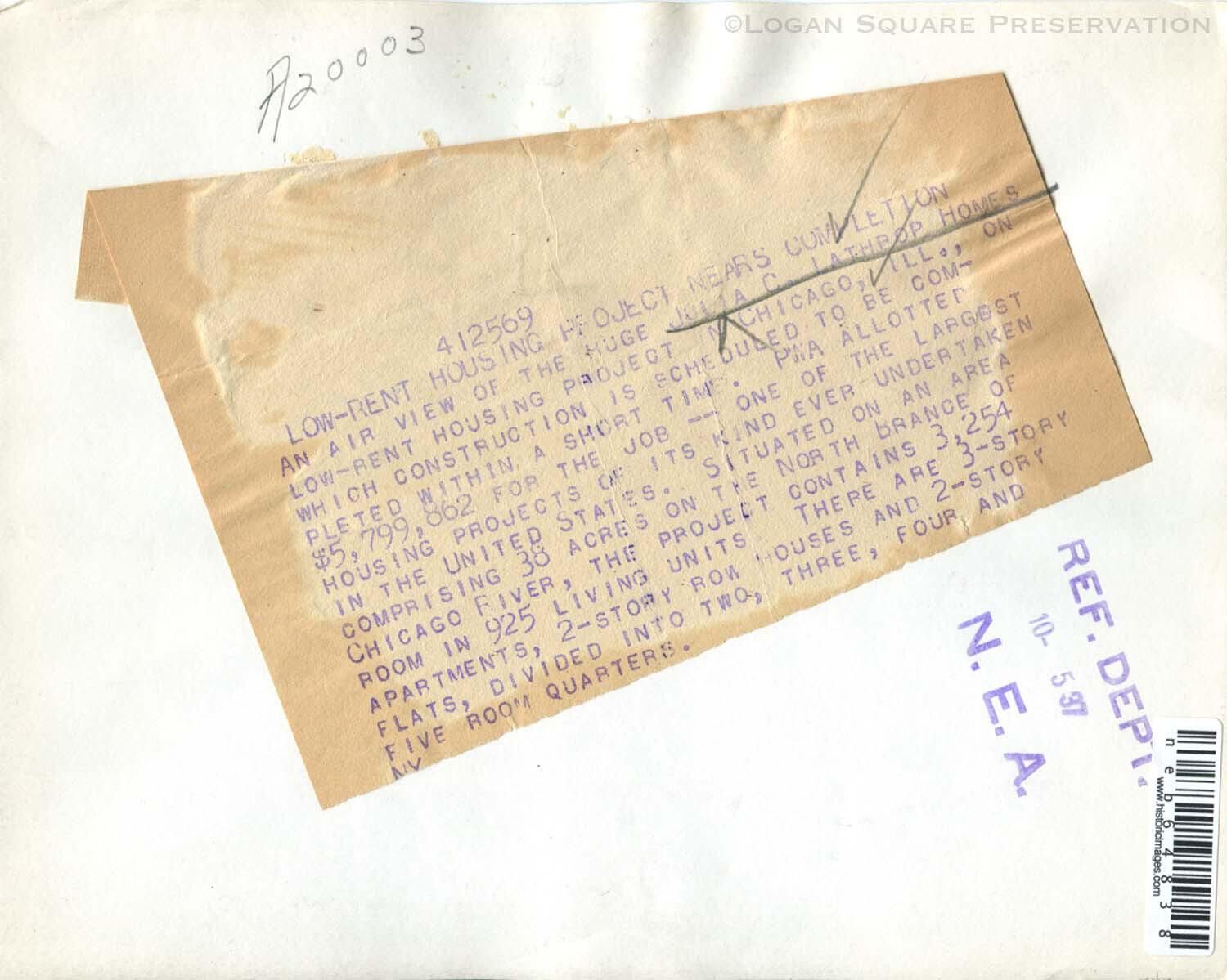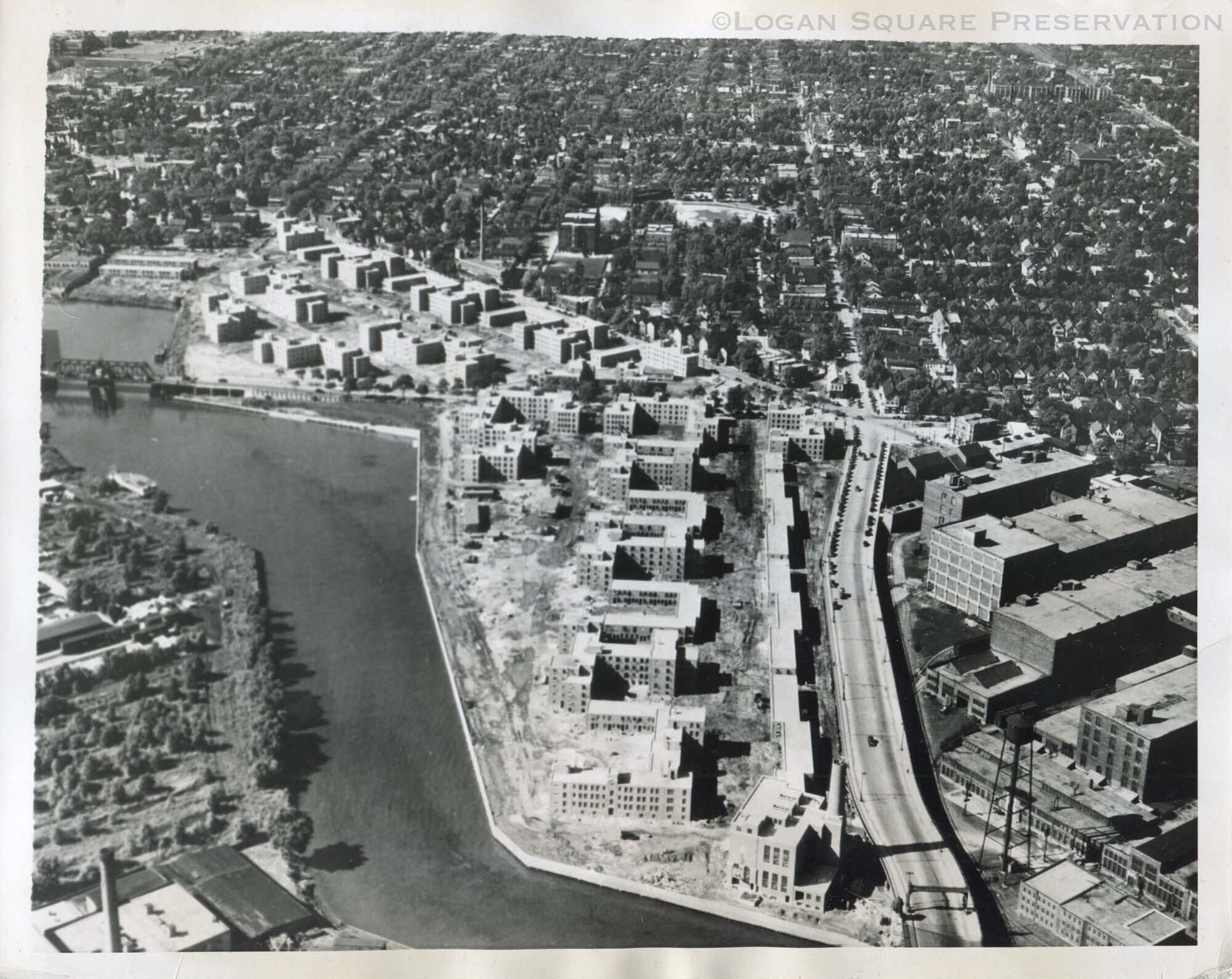 News photo aerial view of Lathrop Homes public housing under construction at Fullerton & Chicago River, taken October 1937Photograph Details