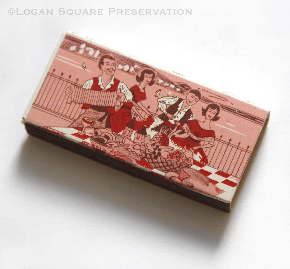 1" matchbox printed in brown and red ink with illustration of musicians at seaside buffet on back, made in Japan, circa 1970Collection