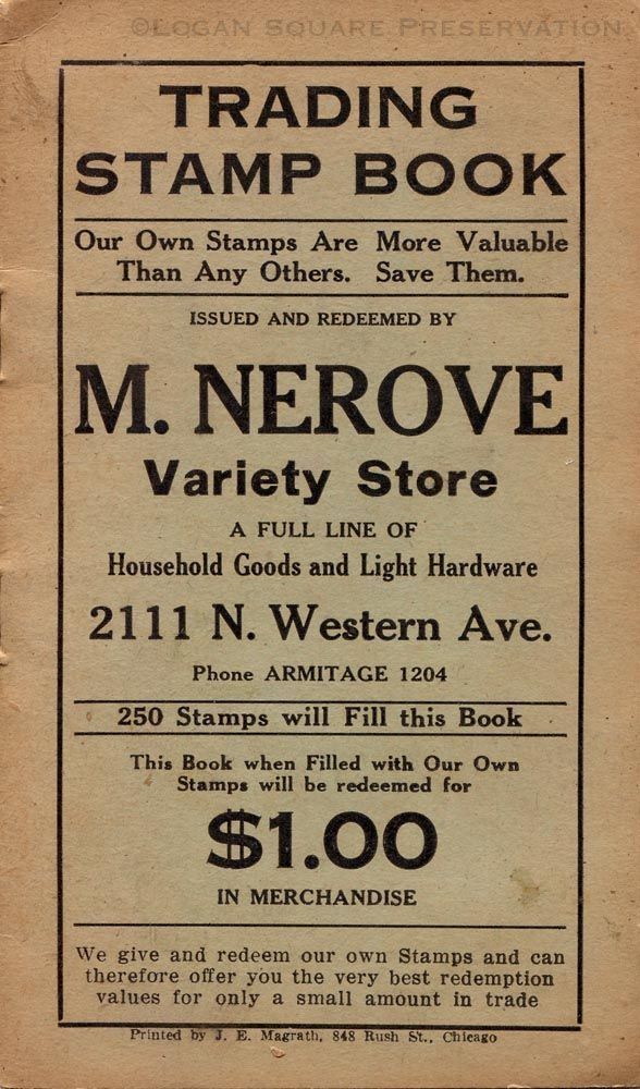 8-pg staple-bound booklet with ivory paper cover for collecting store-issued trading stamps with two complete pages of M. Nerove profit-sharing stamps, circa 1920sBook Details