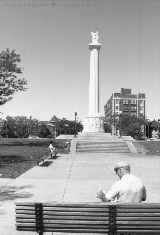 News photo image looking west over shoulder of man reading newspaper at Illinois Centennial Monument at Logan Square Park, taken for Aug 13, 1985 Sun-Times article about new designation of Boulevard Historic DistrictPhotograph Details