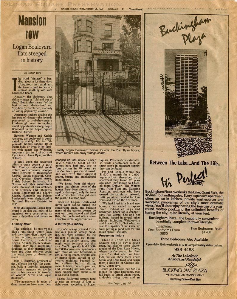Newspaper clipping of article about historic Logan Square rental apartments, October 1990Collection
