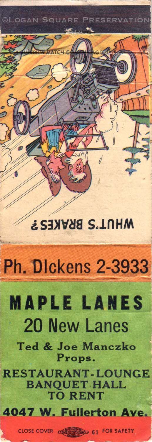 1.5" matchbook for bowling alley with stock cartoon of hillbillies driving jalopy titled "Whut's brakes?" on back, circa 1950sPublication Details