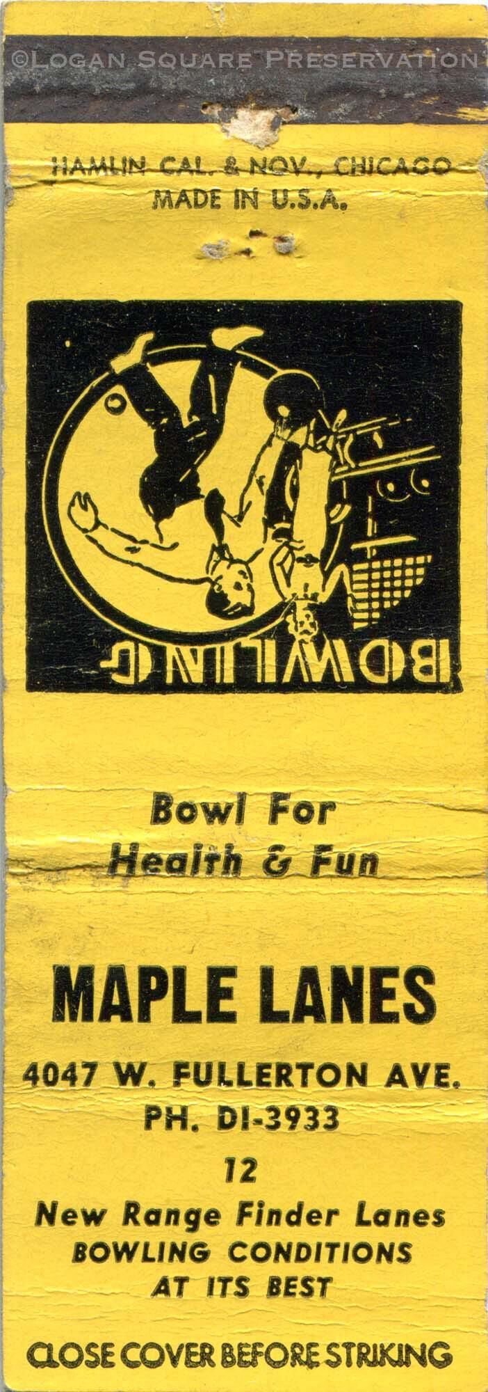 1.5" matchbook printed on yellow background for Maple Lanes bowling alley with stock illustration of man and woman bowling on back, circa 1950sPublication Details