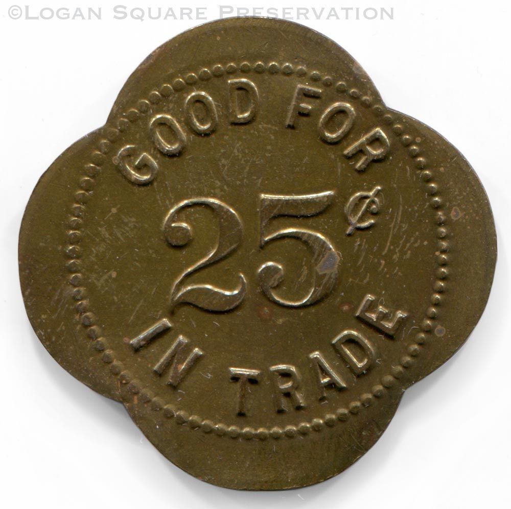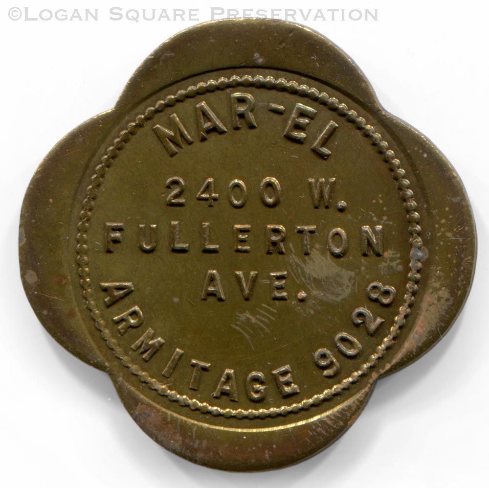 1.25" quatrefoil-shaped brass tavern token good for 25¢ in trade at Mar-El Restaurant, circa 1940sDimensions