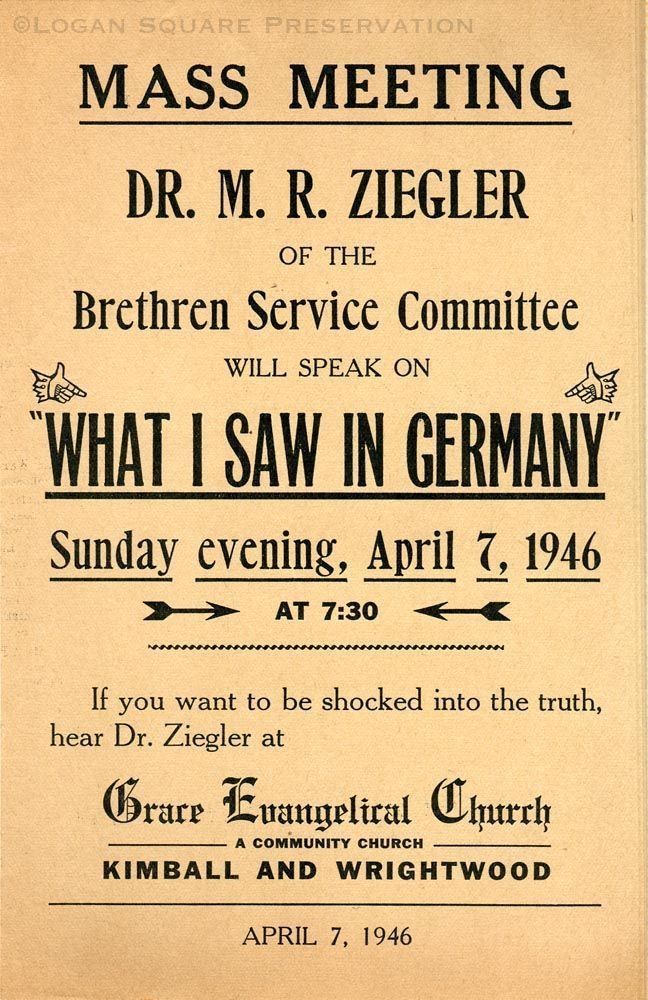 Publicity card on manila paper for evening talk by Dr. Michael Robert Zigler, peace activist and director of the Brethren Service Committee during World War II, Sunday evening, April 7, 1946Collection