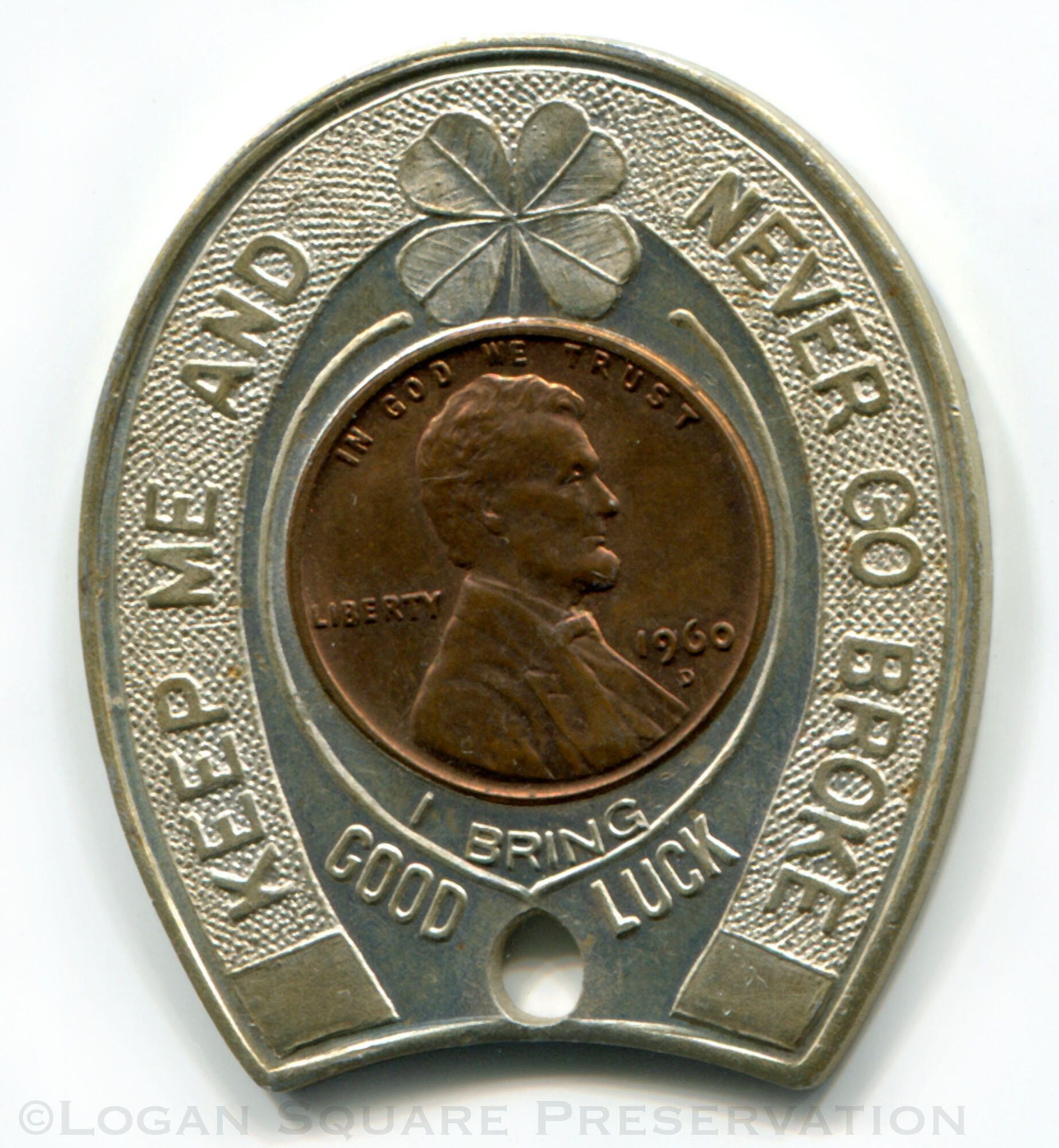 1.25" x 1.625" horseshoe-shaped good luck token or keychain enclosing 1960 pennyDimensions