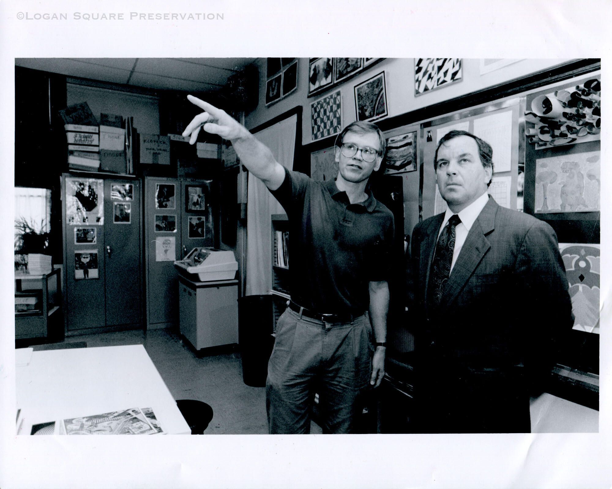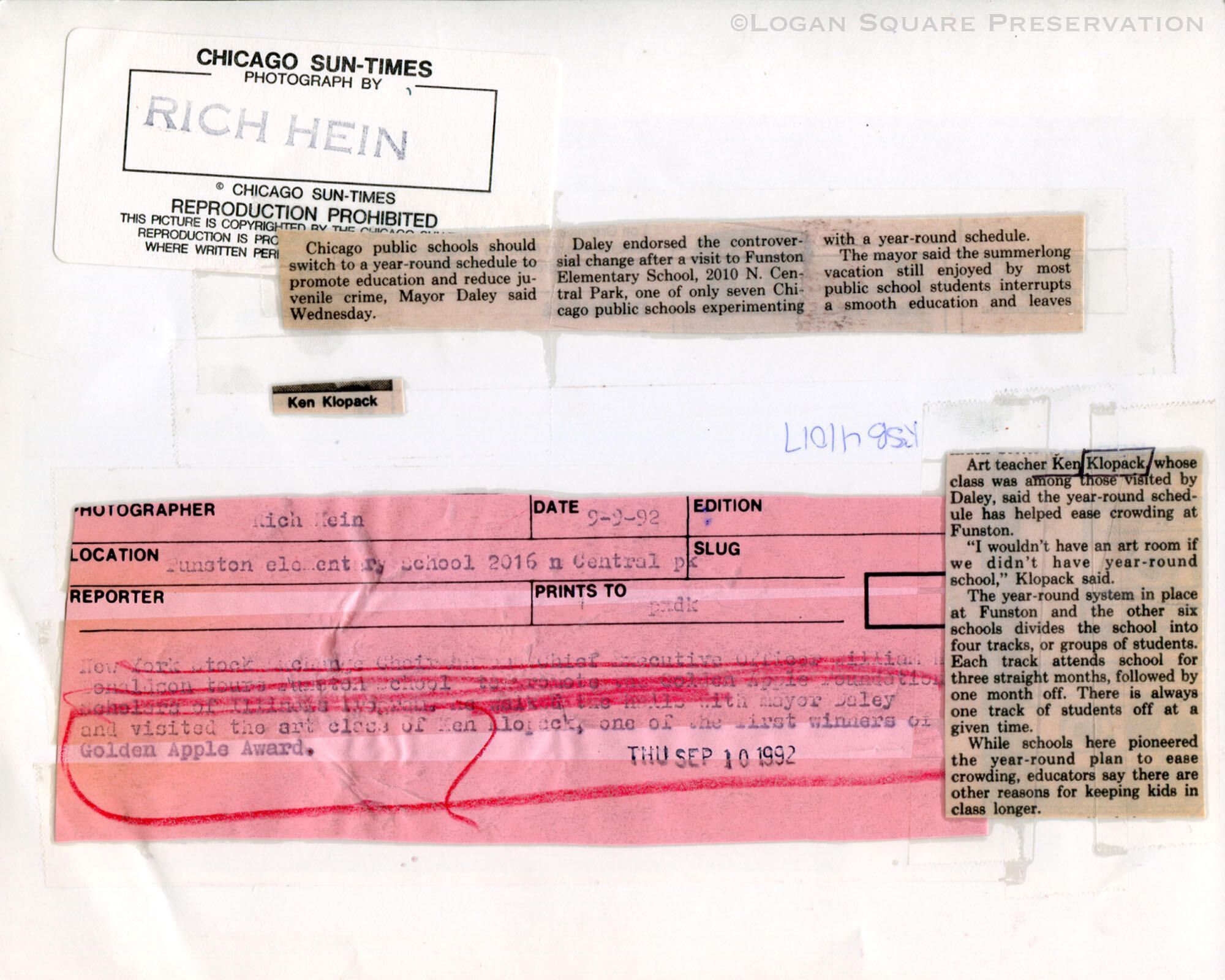 News photo of Mayor Richard M. Daley visiting classroom of Funston Elementary art teacher Ken Klopack, printed in article about year-round school schedule, Sept 1992Photograph Details