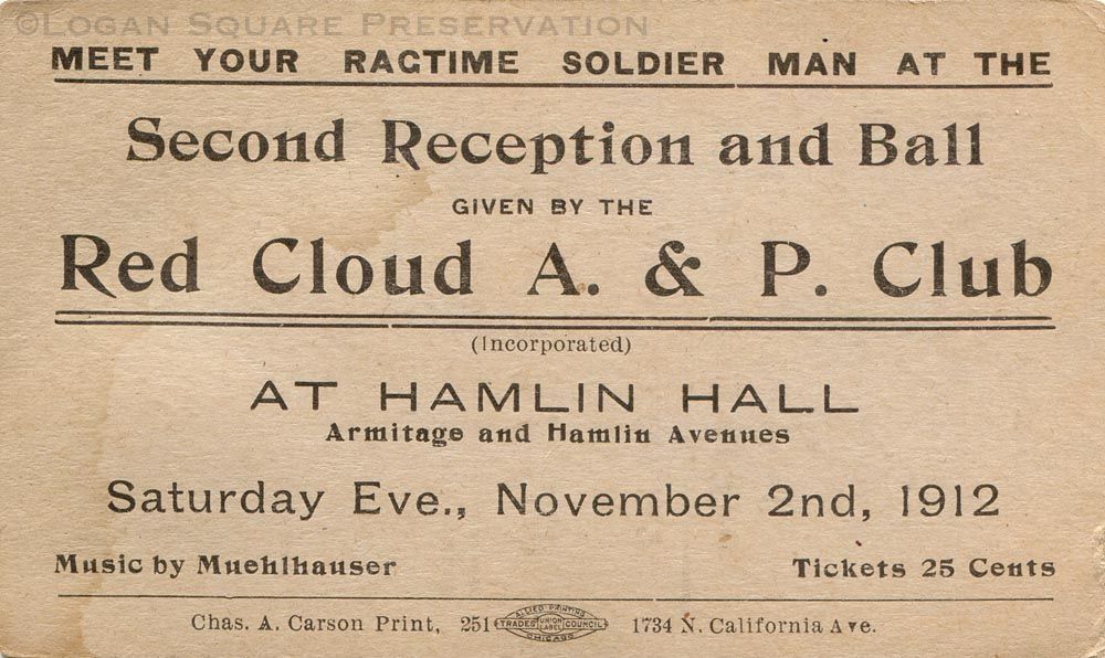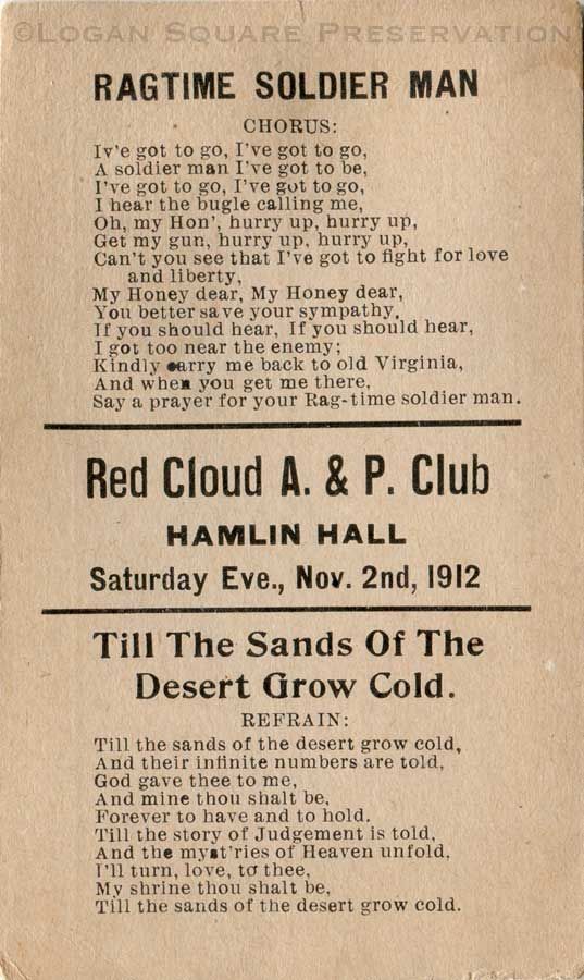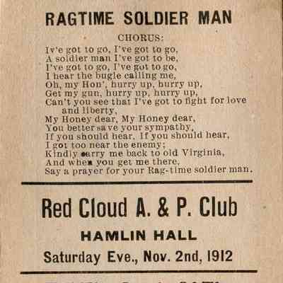 Invitation card to Nov 2, 1912 dance at Hamlin Hall given by Red Cloud Athletic & Pleasure Club with music by Muehlhauser. Lyrics to "Ragtime Soldier Man" and "Till the Sands of the Desert Grow Cold" on back.Publication Details