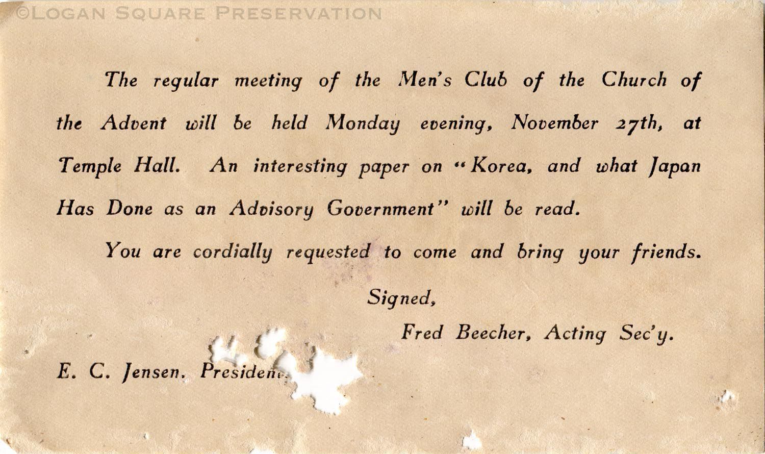 Paper notification of November 27 meeting of Men's Club of the Church of the Advent with a reading of a paper on "Korea, or what Japan Has Done as an Advisory Government", by Fred Beecher, acting secretary, likely 1911 or 1916Collection