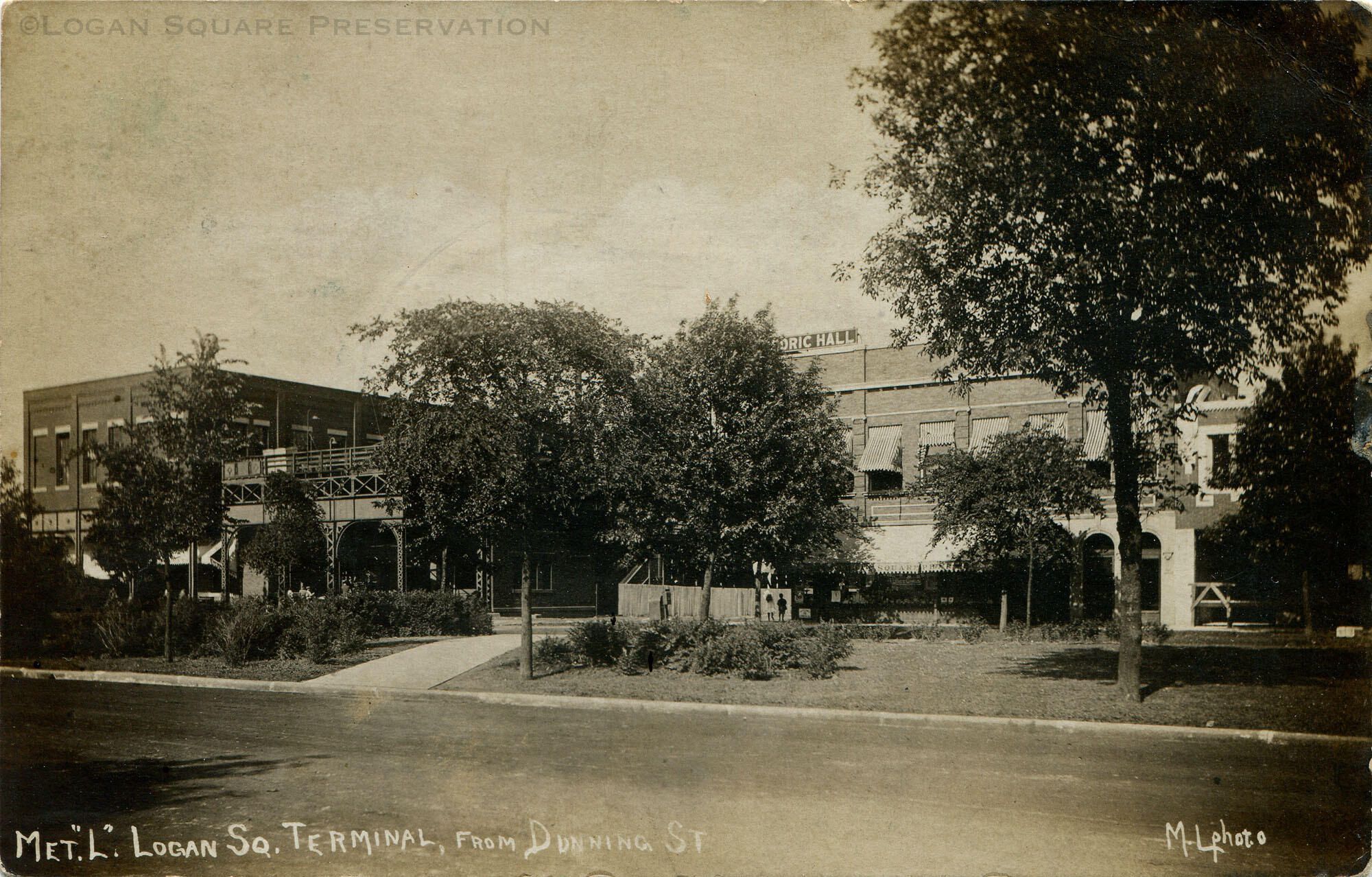 Real-photo postcard view looking northeast across Kedzie Boulevard to Logan Square L Terminal Station and Cedric Hall buildingSubject