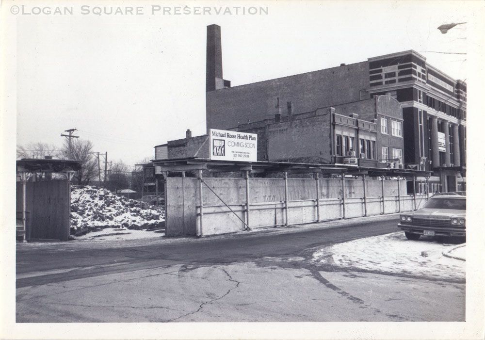 Photo looking southeast at construction site fence and scaffolding surrounding snow-covered pile of bricks from building demolition for construction of new health clinic, circa late 1982Photograph Details