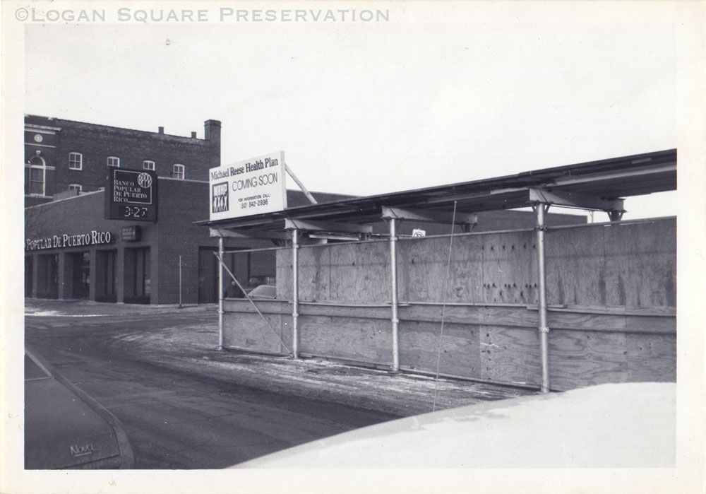Photo looking northeast at construction site fence and scaffolding surrounding for construction of new health clinic, with Logan Square Auditorium in background, circa late 1982Photograph Details