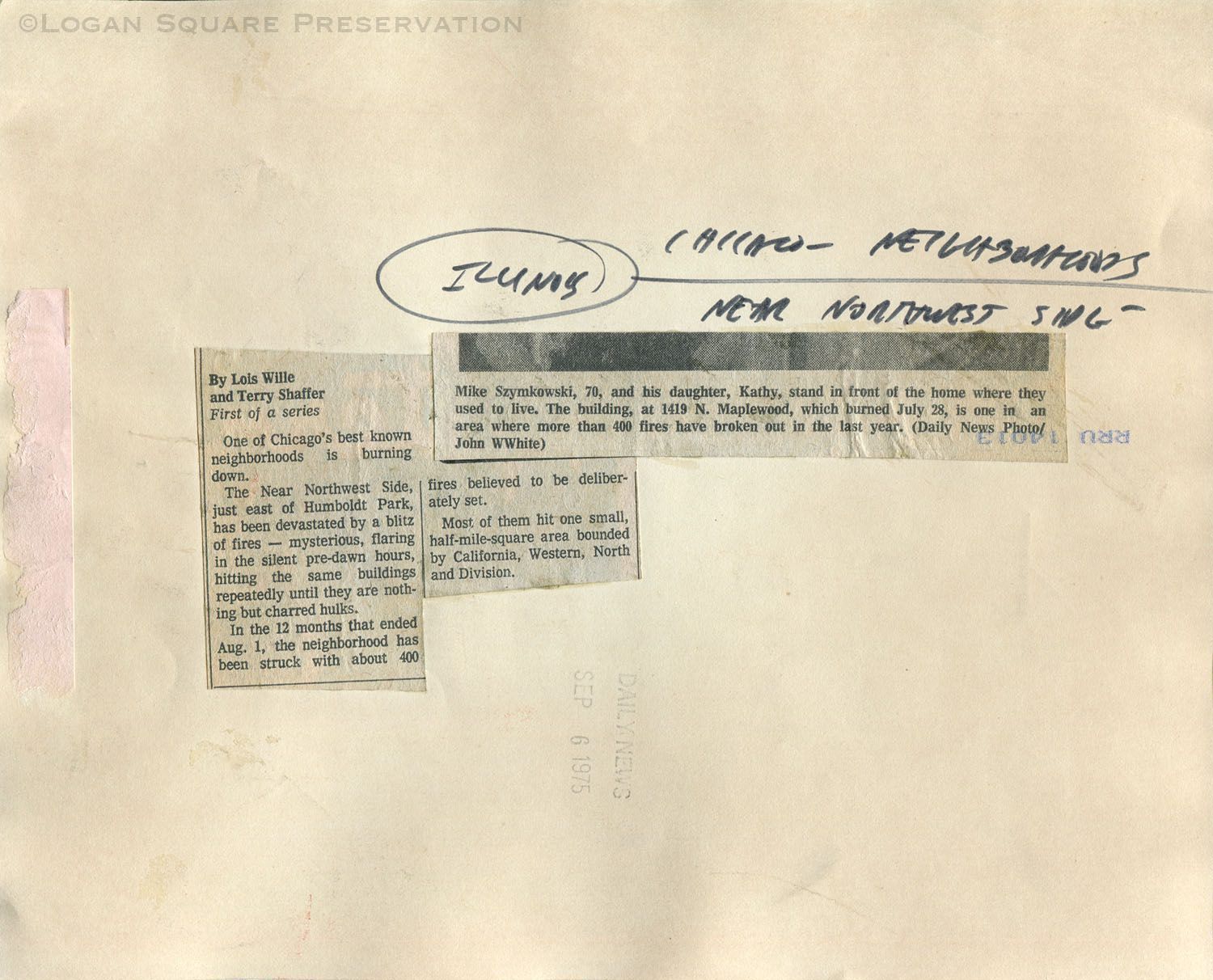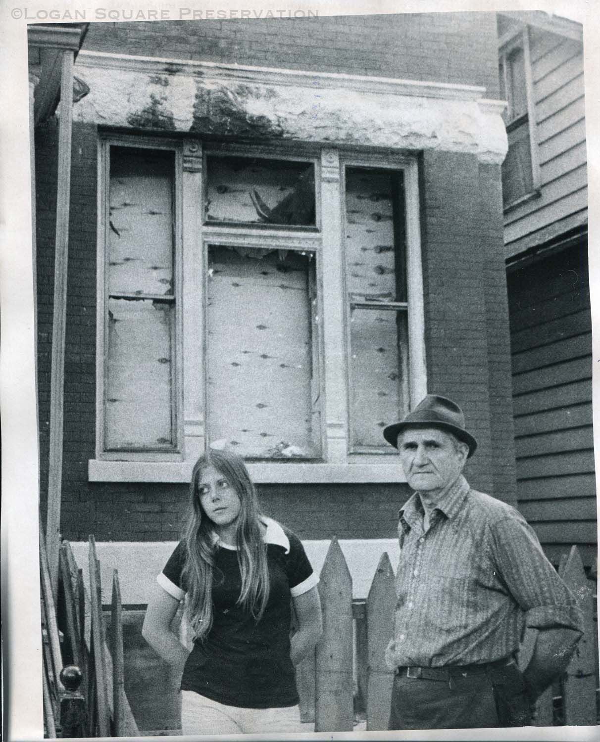 News photo of Mike Szymkowski and daughter Kathy standing next to boarded up window of brick two-flat after one of over 400 arson fires in Humboldt Park in 1974-1975Photograph Details