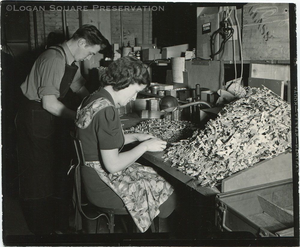 Black and white news photo of woman with short hair and a floral apron sitting at work station next to pile of small juke box parts, with man wearing apron behind, 1943Photograph Details