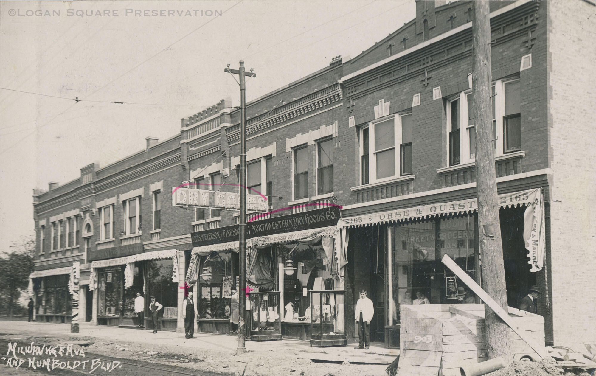 Real-photo postcard view looking north at 2555 - 2569 N Milwaukee Ave storefronts with owners standing in front and signs circled in pink, circa 1909Subject Person/Organization