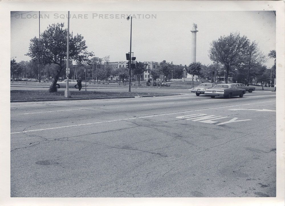 News photo looking southwest across intersection of Milwaukee Ave and Logan Boulevard at traffic and park around Illinois Centennial Monument, circa 1970s-1980sPhotograph Details