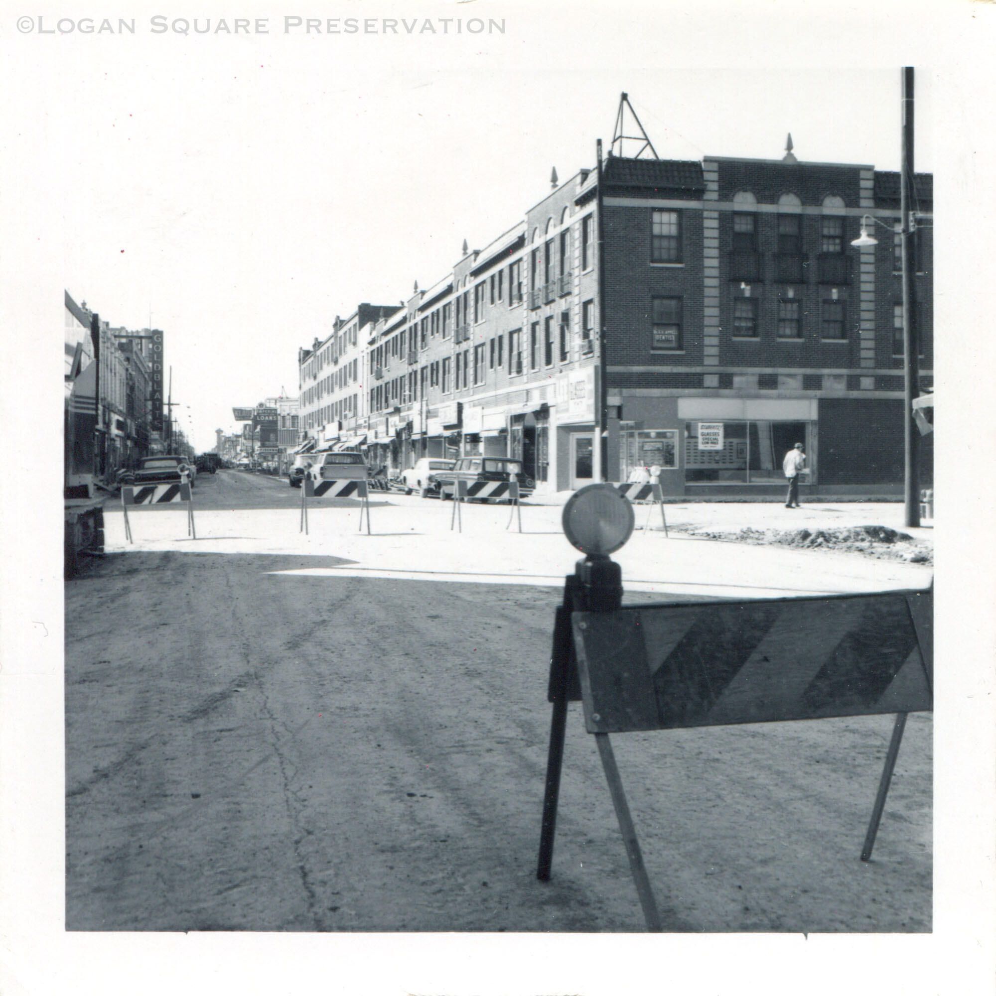 Photo view looking northwest at no-longer-extant 3-story brick storefronts and apartments at 2747 N. Milwaukee past sawhorse barricades blocking street for Blue Line subway construction, circa 1968-69Photograph Details