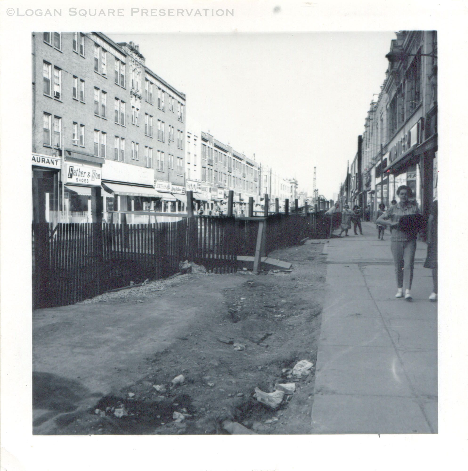 Photo view looking southeast at pedestrians on west sidewalk near fencing around Blue Line subway construction project circa 1968-69Photograph Details
