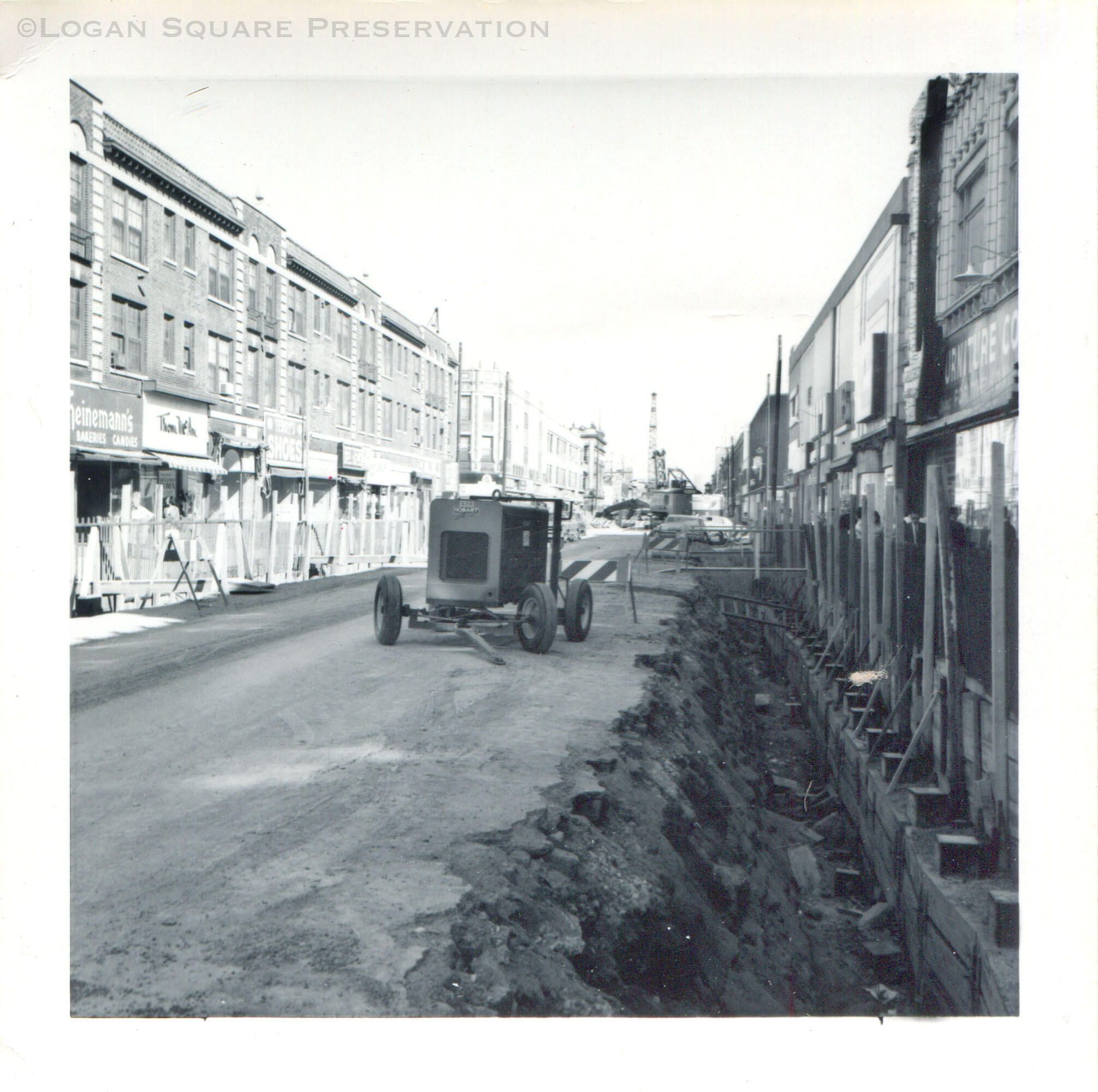 Photo view looking southeast at construction equipment in fenced-off area for Blue Line subway construction, circa 1968-69