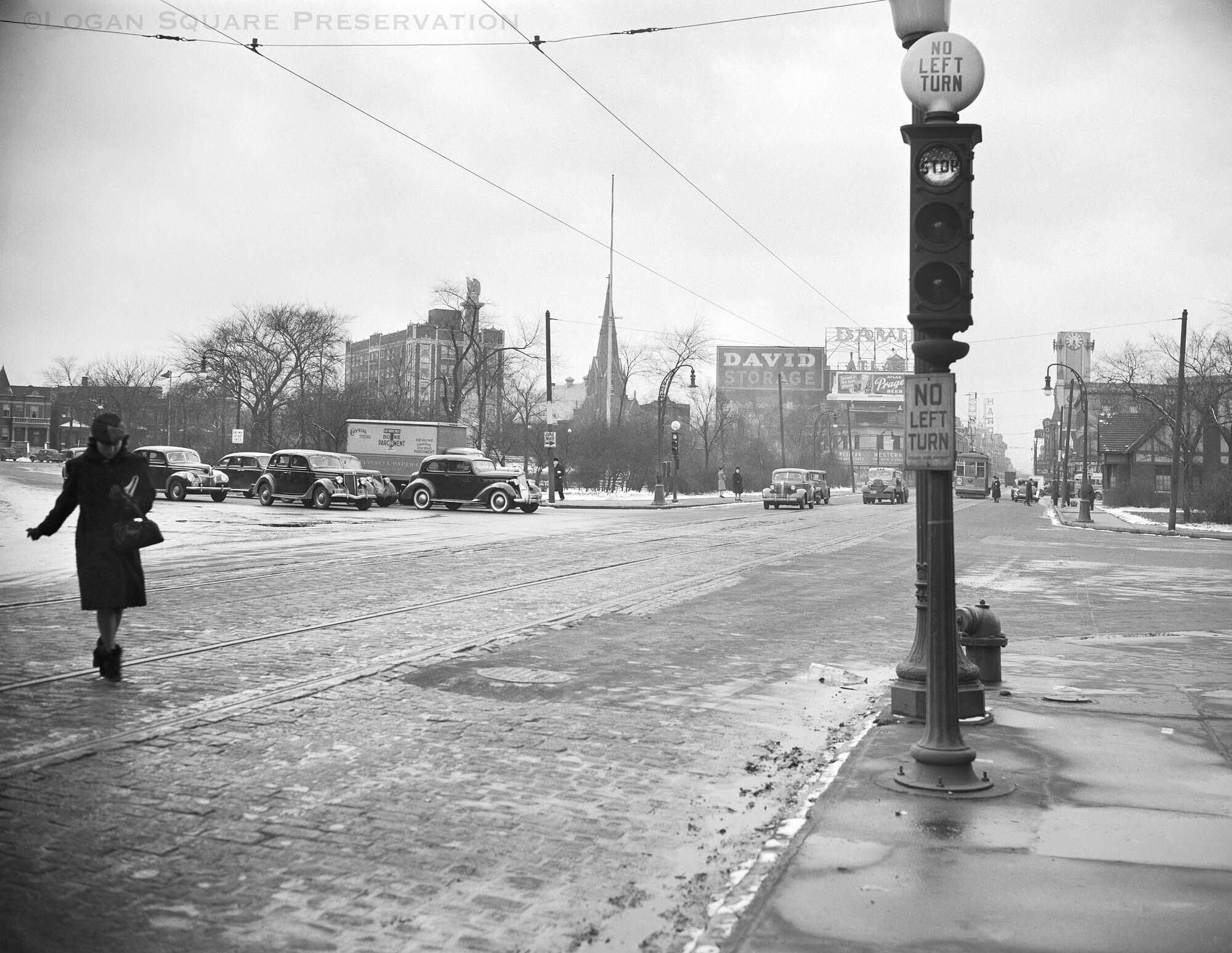 616 film negative with image of woman crossing streetcar tracks and eastbound Logan Blvd traffic waiting at stoplight on winter day, circa 1940s. Logan Vista apartments, Minnekirken, billboards on David Storage buiding, signs for Logan & Harding theaters, Lange Buick tower and Comfort Station visible in distance.Photograph Details