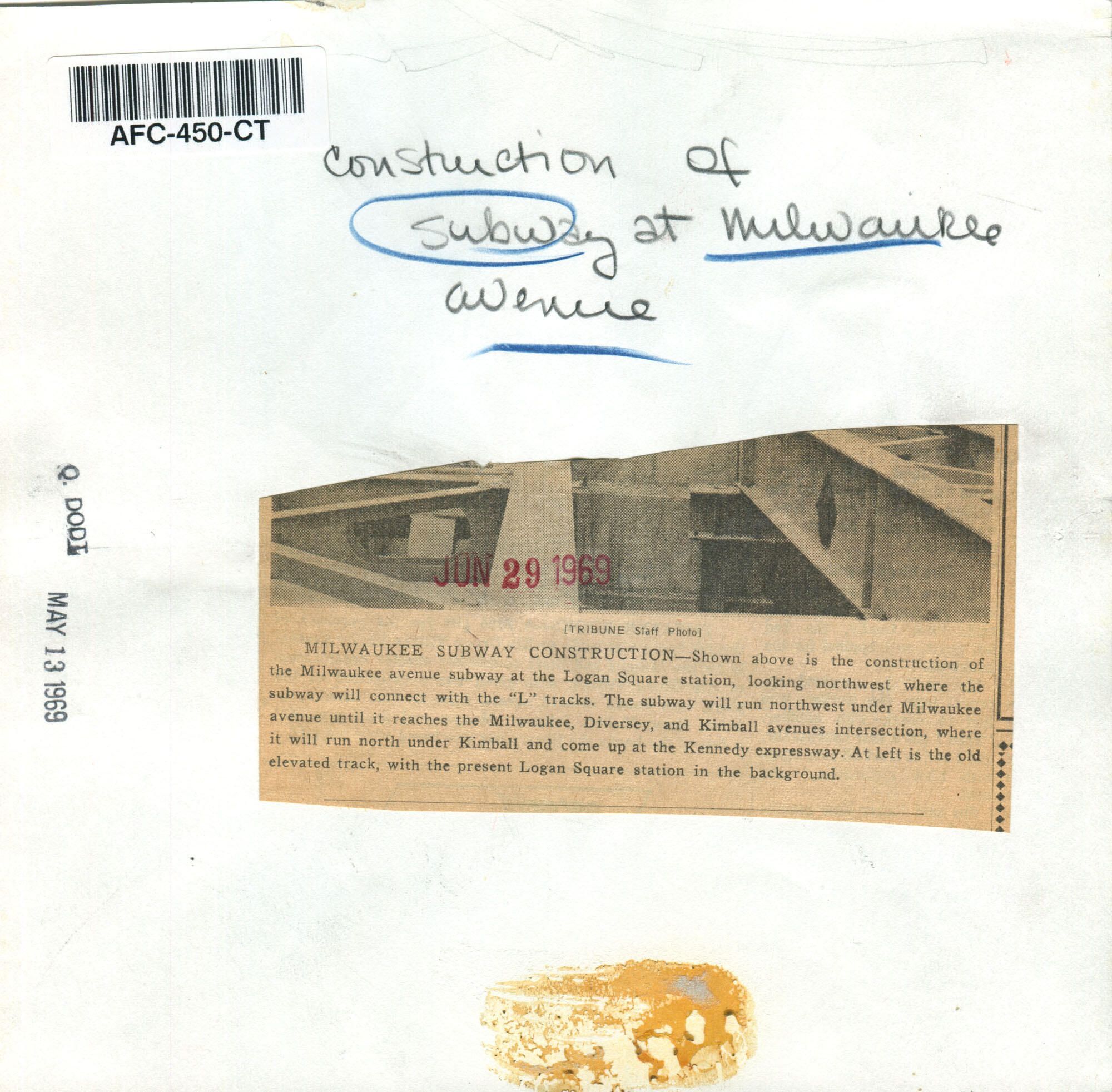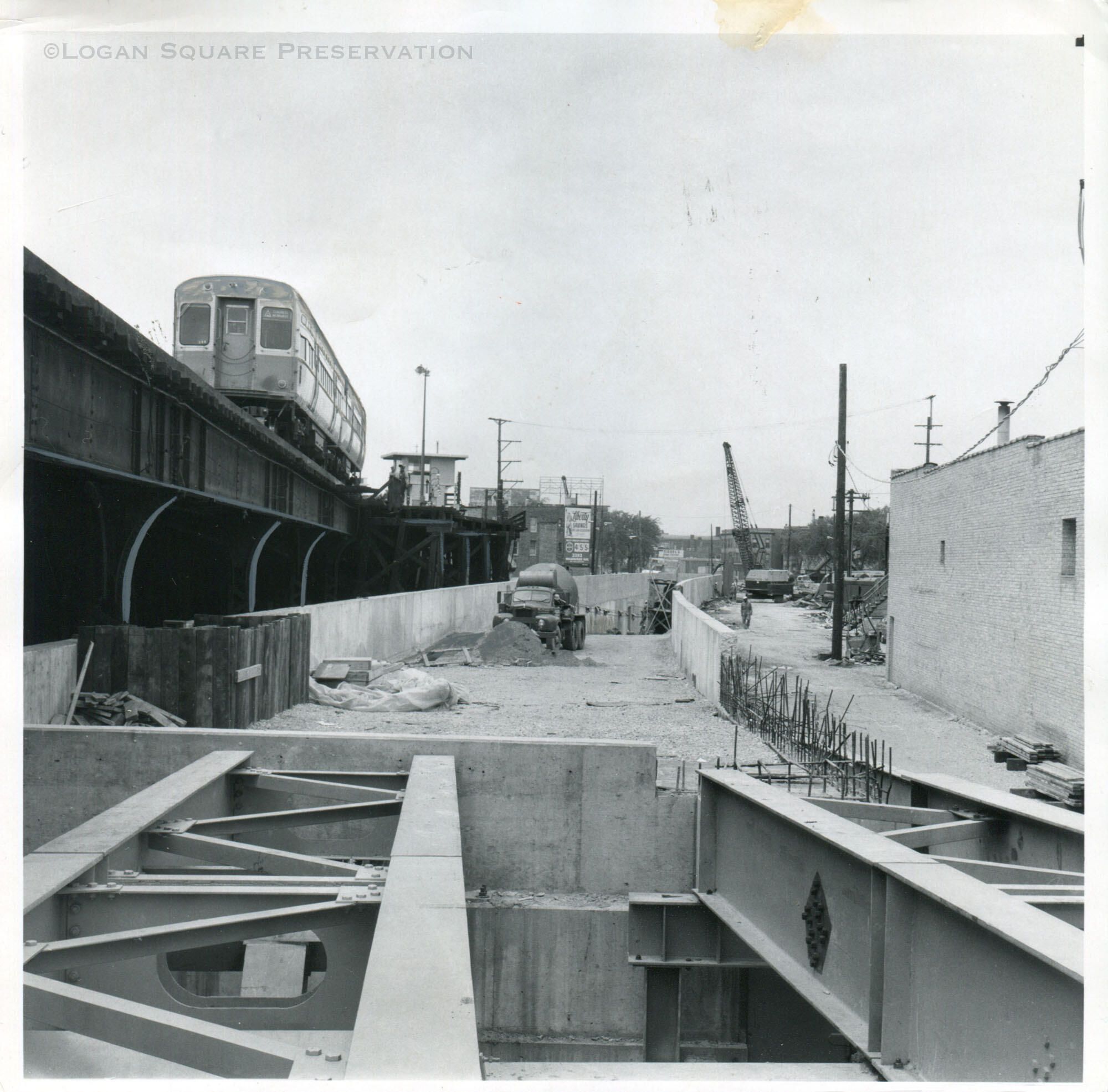News photo image looking northwest at under-construction entrance to subway tunnel underneath Logan Square. Elevated train on tracks at left lead to Logan Square Terminal still in use. Taken May 13, 1969Photograph Details