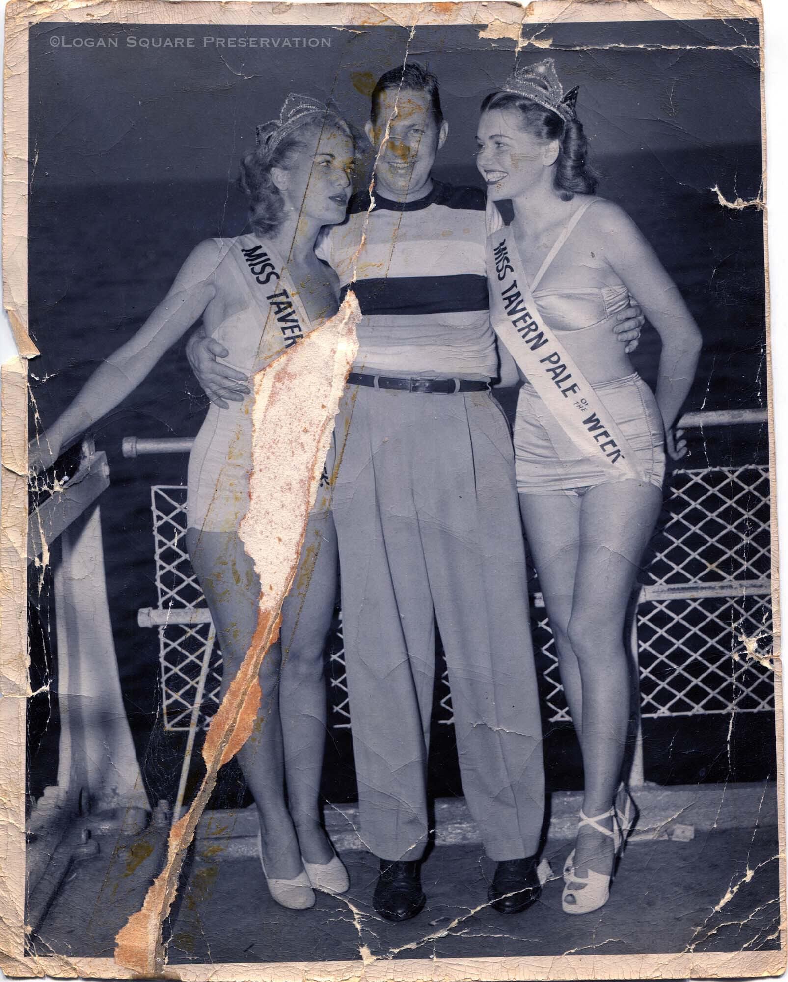 Souvenir [hoto of Bob Inn proprietor Harold Hanson standing by boat railing with two beauty queens wearing "Miss Tavern Pale" sashes, circa 1950s. Photo is torn and repaired with cellophane tapePhotograph Details
