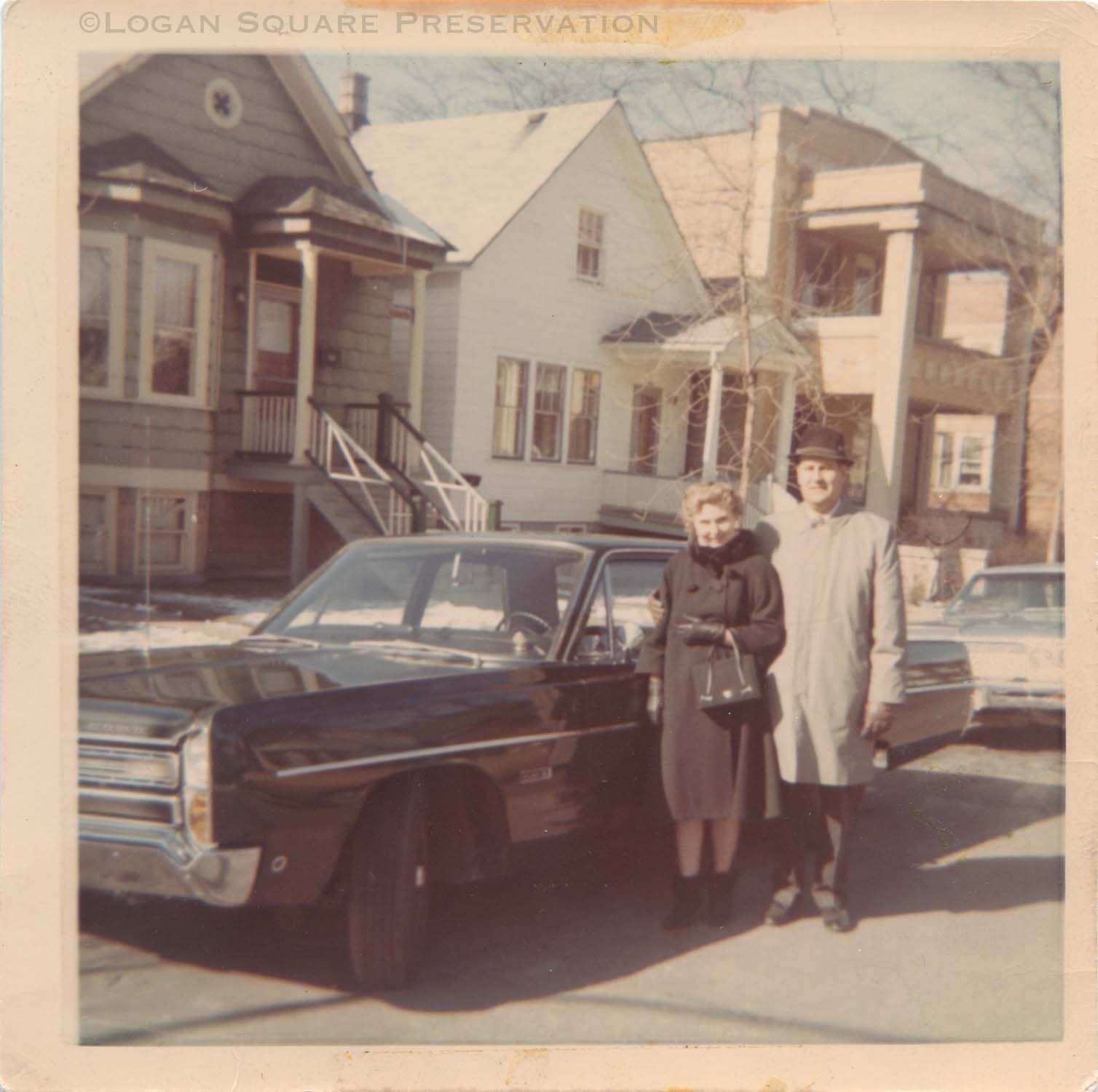 Snapshot photo of Rita & Donald Fye standing next to new Plymouth Fury sedan with cottages and two-flat on Richmond St in background, labelled on back as "Mom, Dad + New Car - Feb 11, 1968"Photograph Details