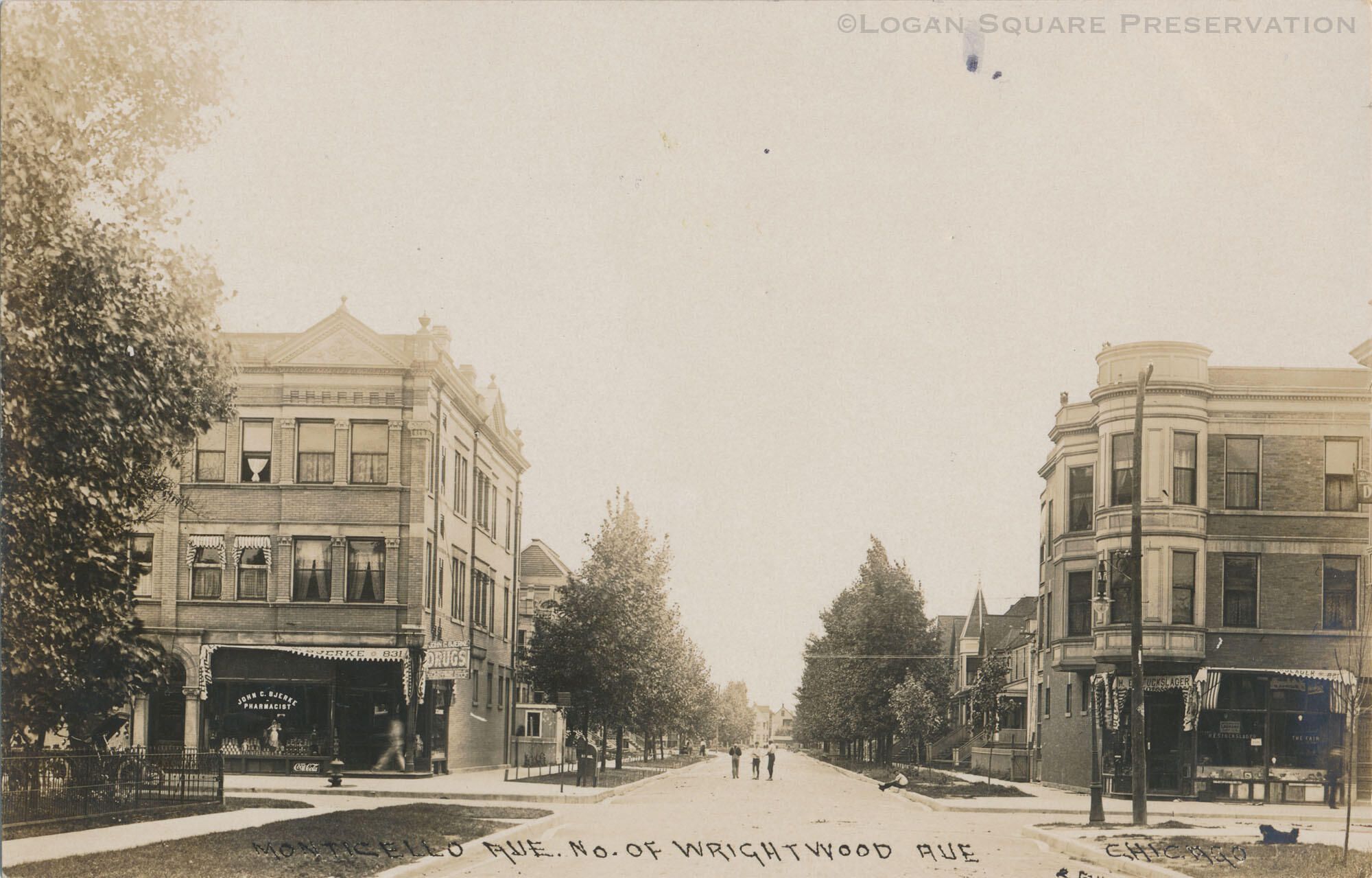 Real-photo postcard view looking north at corner storefronts and flats at Monticello & Wrightwood Aves, circa 1908Subject