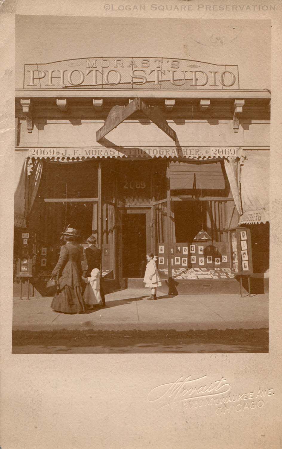 Real-photo postcard view of women and children standing in front of Morast Photo Studio storefront window display with signs above door, sent by John F. Morast to customer M. Moe as notification for pickup of studio portraits, sent May 5, 1911Subject Person/Organization