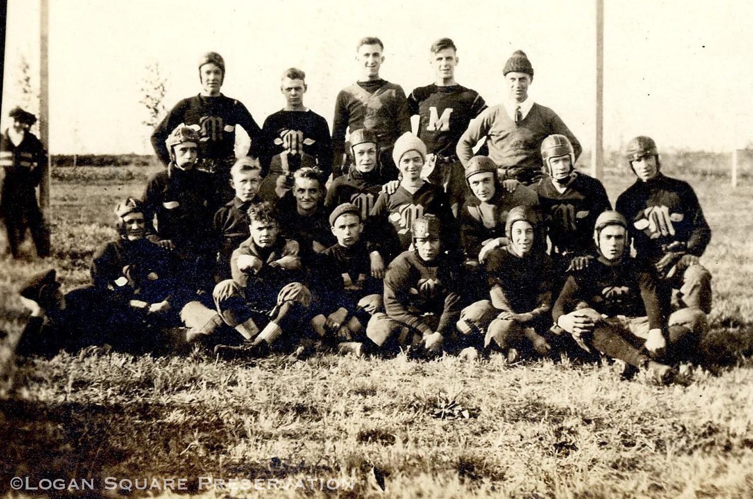 Portrait of Mozart Elementary School football team in uniform with letter "M" jerseys gathered in front of goal post in open field, 1918Photograph Details